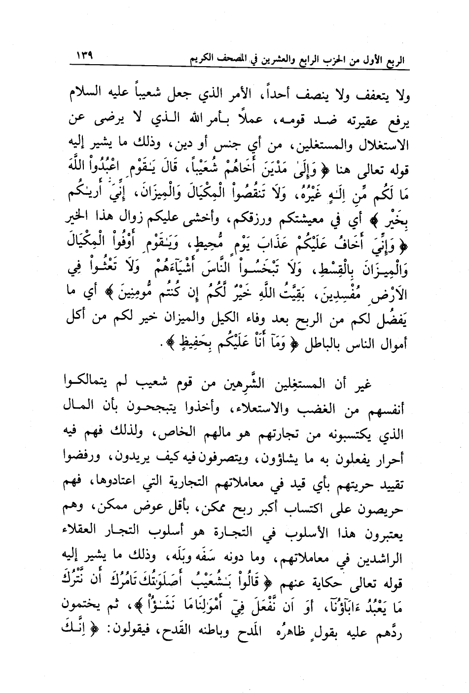ولا يتعفف ولا ينصف أحدا، الأمر الذي جعل شعيبا عليه السلام يرفع عقيرته ضد قومه، عملا بأمر الله الذي لا يرضى عن الاستغلال والمستغلين، من أي جنس أو دين، وذلك ما يشير إليه قوله تعالى هنا: {وَإِلَى مَدْيَنَ أَخَاهُمْ شُعَيْبًا قَالَ يَا قَوْمِ اعْبُدُوا اللَّهَ مَا لَكُمْ مِنْ إِلَهٍ غَيْرُهُ وَلَا تَنْقُصُوا الْمِكْيَالَ وَالْمِيزَانَ إِنِّي أَرَاكُمْ بِخَيْرٍ} أي في معيشتكم ورزقكم، وأخشى عليكم زوال هذا الخير {وَإِنِّي أَخَافُ عَلَيْكُمْ عَذَابَ يَوْمٍ مُحِيطٍ * وَيَا قَوْمِ أَوْفُوا الْمِكْيَالَ وَالْمِيزَانَ بِالْقِسْطِ وَلَا تَبْخَسُوا النَّاسَ أَشْيَاءَهُمْ وَلَا تَعْثَوْا فِي الْأَرْضِ مُفْسِدِينَ * بَقِيَّتُ اللَّهِ خَيْرٌ لَكُمْ إِنْ كُنْتُمْ مُؤْمِنِينَ} أي ما يفضل لكم من الربح بعد وفاء الكيل والميزان خير لكم من أكل أموال الناس بالباطل {وَمَا أَنَا عَلَيْكُمْ بِحَفِيظٍ}.