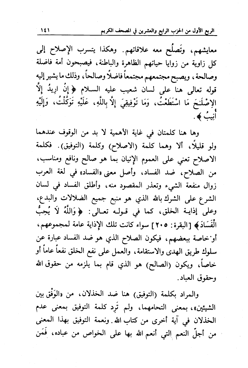 معايشهم، وتصلح معه علاقاتهم. وهكذا يتسرب الإصلاح إلى كل زاوية من زوايا حياتهم الظاهرة والباطنة، فيصبحون أمة فاضلة وصالحة، ويصبح مجتمعهم مجتمعا فاضلا وصالحا، وذلك ما يشير إليه قوله تعالى هنا على لسان شعيب عليه السلام {إِنْ أُرِيدُ إِلَّا الْإِصْلَاحَ مَا اسْتَطَعْتُ وَمَا تَوْفِيقِي إِلَّا بِاللَّهِ عَلَيْهِ تَوَكَّلْتُ وَإِلَيْهِ أُنِيبُ}.