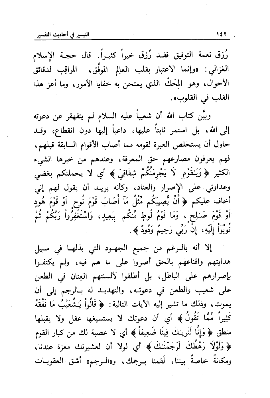 وبيَّن كتاب الله أن شعيبا عليه السلام لم يتقهقر عن دعوته إلى الله، بل استمر ثابتا عليها، داعيا إليها دون انقطاع، وقد حاول أن يستخلص العبرة لقومه مما أصاب الأقوام السابقة قبلهم، فهم يعرفون مصارعهم حق المعرفة، وعندهم من خبرها الشيء الكثير {وَيَا قَوْمِ لَا يَجْرِمَنَّكُمْ شِقَاقِي} أي لا يحملنكم بغضي وعداوتي على الإصرار والعناد، وكأنه يريد أن يقول لهم إني أخاف عليكم {أَنْ يُصِيبَكُمْ مِثْلُ مَا أَصَابَ قَوْمَ نُوحٍ أَوْ قَوْمَ هُودٍ أَوْ قَوْمَ صَالِحٍ وَمَا قَوْمُ لُوطٍ مِنْكُمْ بِبَعِيدٍ * وَاسْتَغْفِرُوا رَبَّكُمْ ثُمَّ تُوبُوا إِلَيْهِ إِنَّ رَبِّي رَحِيمٌ وَدُودٌ}.