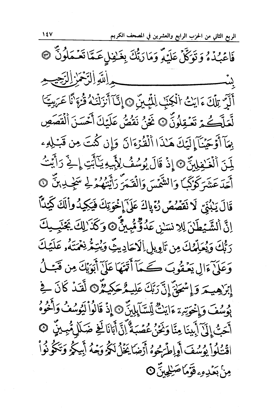 الر تِلْكَ آيَاتُ الْكِتَابِ الْمُبِينِ (1) إِنَّا أَنْزَلْنَاهُ قُرْآنًا عَرَبِيًّا لَعَلَّكُمْ تَعْقِلُونَ (2) نَحْنُ نَقُصُّ عَلَيْكَ أَحْسَنَ الْقَصَصِ بِمَا أَوْحَيْنَا إِلَيْكَ هَذَا الْقُرْآنَ وَإِنْ كُنْتَ مِنْ قَبْلِهِ لَمِنَ الْغَافِلِينَ (3) إِذْ قَالَ يُوسُفُ لِأَبِيهِ يَا أَبَتِ إِنِّي رَأَيْتُ أَحَدَ عَشَرَ كَوْكَبًا وَالشَّمْسَ وَالْقَمَرَ رَأَيْتُهُمْ لِي سَاجِدِينَ (4) قَالَ يَا بُنَيَّ لَا تَقْصُصْ رُؤْيَاكَ عَلَى إِخْوَتِكَ فَيَكِيدُوا لَكَ كَيْدًا إِنَّ الشَّيْطَانَ لِلْإِنْسَانِ عَدُوٌّ مُبِينٌ (5) وَكَذَلِكَ يَجْتَبِيكَ رَبُّكَ وَيُعَلِّمُكَ مِنْ تَأْوِيلِ الْأَحَادِيثِ وَيُتِمُّ نِعْمَتَهُ عَلَيْكَ وَعَلَى آلِ يَعْقُوبَ كَمَا أَتَمَّهَا عَلَى أَبَوَيْكَ مِنْ قَبْلُ إِبْرَاهِيمَ وَإِسْحَاقَ إِنَّ رَبَّكَ عَلِيمٌ حَكِيمٌ (6) لَقَدْ كَانَ فِي يُوسُفَ وَإِخْوَتِهِ آيَاتٌ لِلسَّائِلِينَ (7) إِذْ قَالُوا لَيُوسُفُ وَأَخُوهُ أَحَبُّ إِلَى أَبِينَا مِنَّا وَنَحْنُ عُصْبَةٌ إِنَّ أَبَانَا لَفِي ضَلَالٍ مُبِينٍ (8) اقْتُلُوا يُوسُفَ أَوِ اطْرَحُوهُ أَرْضًا يَخْلُ لَكُمْ وَجْهُ أَبِيكُمْ وَتَكُونُوا مِنْ بَعْدِهِ قَوْمًا صَالِحِينَ (9)