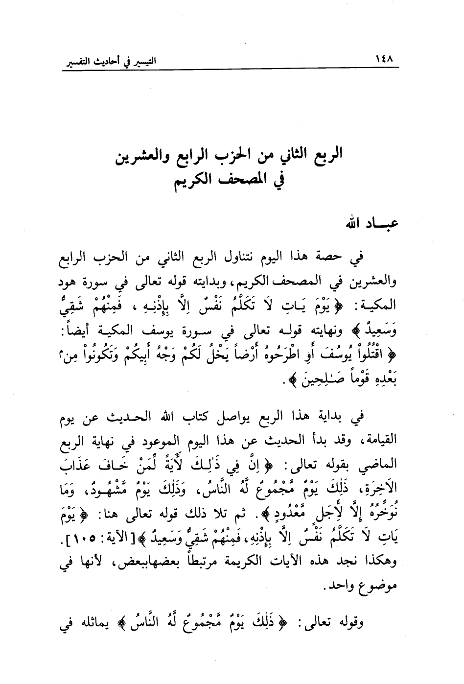 في بداية هذا الربع يواصل كتاب الله الحديث عن يوم القيامة، وقد بدأ الحديث عن هذا اليوم الموعود في نهاية الربع الماضي بقوله تعالى: {إِنَّ فِي ذَلِكَ لَآيَةً لِمَنْ خَافَ عَذَابَ الْآخِرَةِ ذَلِكَ يَوْمٌ مَجْمُوعٌ لَهُ النَّاسُ وَذَلِكَ يَوْمٌ مَشْهُودٌ * وَمَا نُؤَخِّرُهُ إِلَّا لِأَجَلٍ مَعْدُودٍ}. ثم تلا ذلك قوله تعالى هنا: {يَوْمَ يَأْتِ لَا تَكَلَّمُ نَفْسٌ إِلَّا بِإِذْنِهِ فَمِنْهُمْ شَقِيٌّ وَسَعِيدٌ} [الآية: 105]. وهكذا نجد هذه الآيات الكريمة مرتبطا بعضها ببعض، لأنها في موضوع واحد.