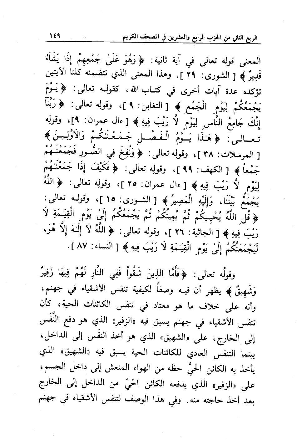 وقوله تعالى: {فَأَمَّا الَّذِينَ شَقُوا فَفِي النَّارِ لَهُمْ فِيهَا زَفِيرٌ وَشَهِيقٌ} يظهر أن فيه وصفا لكيفية تنفس الأشقياء في جهنم، وأنه على خلاف ما هو معتاد في تنفس الكائنات الحية، كأن تنفس الأشقياء في جهنم يسبق فيه " الزفير " الذي هو دفع النفس إلى الخارج، على " الشهيق " الذي هو أخذ النفس إلى الداخل، بينما التنفس العادي للكائنات الحية يسبق فيه " الشهيق " الذي يأخذ به الكائن الحي حظه من الهواء المنعش إلى داخل الجسم، على " الزفير " الذي يدفعه الكائن الحي من الداخل إلى الخارج بعد أخذ حاجته منه. وفي هذا الوصف لتنفس الأشقياء في جهنم