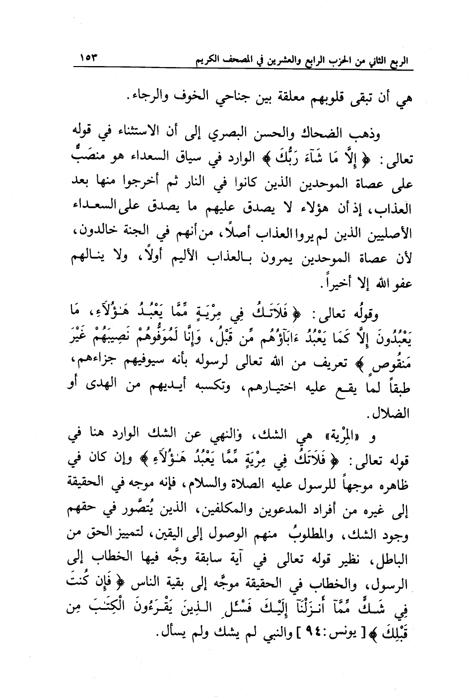 وقوله تعالى: {فَلَا تَكُ فِي مِرْيَةٍ مِمَّا يَعْبُدُ هَؤُلَاءِ مَا يَعْبُدُونَ إِلَّا كَمَا يَعْبُدُ آبَاؤُهُمْ مِنْ قَبْلُ وَإِنَّا لَمُوَفُّوهُمْ نَصِيبَهُمْ غَيْرَ مَنْقُوصٍ} تعريف من الله تعالى لرسوله بأنه سيوفيهم جزاءهم، طبقا لما يقع عليه اختيارهم، وتكسبه أيديهم من الهدى أو الضلال.