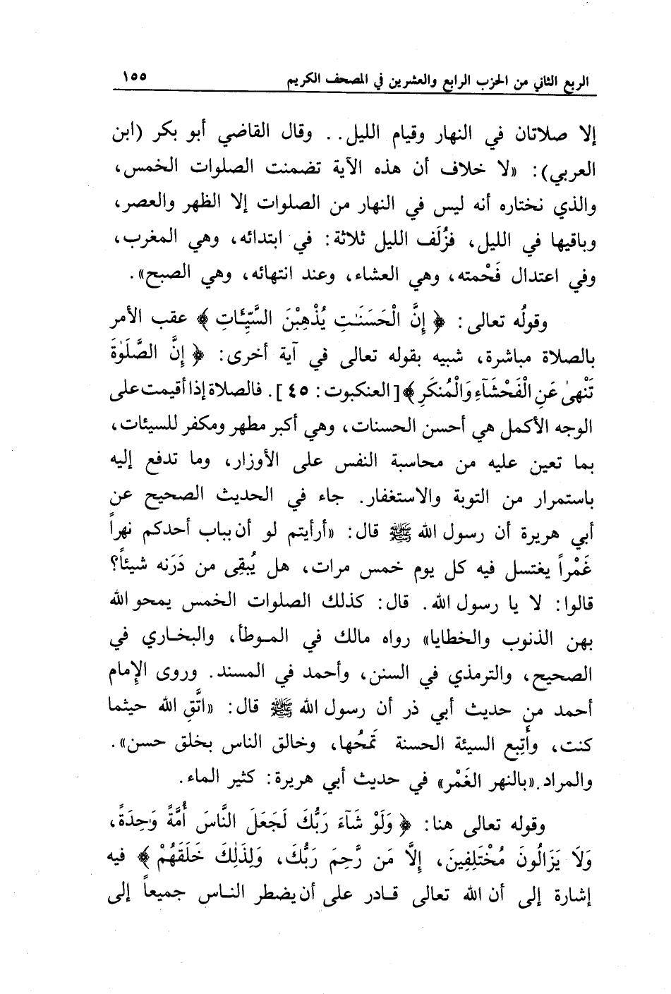 وقوله تعالى: {إِنَّ الْحَسَنَاتِ يُذْهِبْنَ السَّيِّئَاتِ} عقب الأمر بالصلاة مباشرة، شبيه بقوله تعالى في آية أخرى: {إِنَّ الصَّلَاةَ تَنْهَى عَنِ الْفَحْشَاءِ وَالْمُنْكَرِ} [العنكبوت: 45]. فالصلاة إذا أقيمت على الوجه الأكمل هي أحسن الحسنات، وهي أكبر مطهر ومكفر للسيئات، بما تعين عليه من محاسبة النفس على الأوزار، وما تدفع إليه باستمرار من التوبة والاستغفار. جاء في الحديث الصحيح عن أبي هريرة أن رسول الله صلى الله عليه وسلم قال: (أرأيتم لو أن بباب أحدكم نهرا غمرا يغتسل فيه كل يوم خمس مرات، هل يبقى من درنه شيئا؟ قالوا: لا يا رسول الله. قال: كذلك الصلوات الخمس يمحو الله بهن الذنوب والخطايا) رواه مالك في الموطأ، والبخاري في الصحيح، والترمذي في السنن، وأحمد في المسند. وروى الإمام أحمد من حديث أبي ذر أن رسول الله صلى الله عليه وسلم قال: (اتق الله حيثما كنت، وأتبع السيئة الحسنة تمحها، وخالق الناس بخلق حسن). والمراد " بالنهر الغمر " في حديث أبي هريرة: كثير الماء.