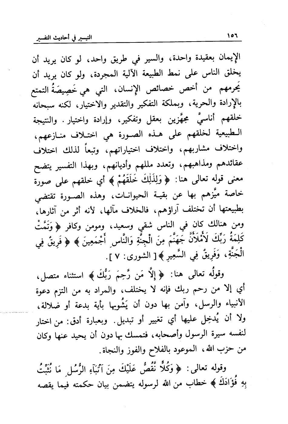 الإيمان بعقيدة واحدة، والسير في طريق واحد، لو كان يريد أن يخلق الناس على نمط الطبيعة الآلية المجردة، لو كان يريد أن يحرمهم من أخص خصائص الإنسان، التي هي خصيصة التمتع بالإرادة والحرية، وبملكة التفكير والتقدير والاختيار، لكنه سبحانه خلقهم أناسي مجهزين بعقل وتفكر، وإرادة واختيار. والنتيجة الطبيعية لخلقهم على هذه الصورة هي اختلاف منازعهم، واختلاف مشاربهم، واختلاف اختياراتهم، وتبعا لذلك اختلاف عقائدهم ومذاهبهم، وتعدد مللهم وأديانهم، وبهذا التفسير يتضح معنى قوله تعالى هنا: {وَلِذَلِكَ خَلَقَهُمْ} أي خلقهم على صورة خاصة ميزهم بها عن بقية الحيوانات، وهذه الصورة تقتضي بطبيعتها أن تختلف آراؤهم، فالخلاف مآلها، لأنه أثر من آثارها، ومن هنالك كان في الناس شقي وسعيد، ومؤمن وكافر {وَتَمَّتْ كَلِمَةُ رَبِّكَ لَأَمْلَأَنَّ جَهَنَّمَ مِنَ الْجِنَّةِ وَالنَّاسِ أَجْمَعِينَ} {فَرِيقٌ فِي الْجَنَّةِ وَفَرِيقٌ فِي السَّعِيرِ} [الشورى: 7].