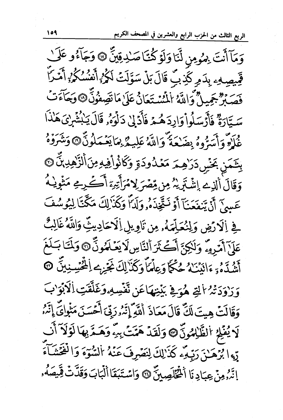 وَمَا أَنْتَ بِمُؤْمِنٍ لَنَا وَلَوْ كُنَّا صَادِقِينَ (17) وَجَاءُوا عَلَى قَمِيصِهِ بِدَمٍ كَذِبٍ قَالَ بَلْ سَوَّلَتْ لَكُمْ أَنْفُسُكُمْ أَمْرًا فَصَبْرٌ جَمِيلٌ وَاللَّهُ الْمُسْتَعَانُ عَلَى مَا تَصِفُونَ (18) وَجَاءَتْ سَيَّارَةٌ فَأَرْسَلُوا وَارِدَهُمْ فَأَدْلَى دَلْوَهُ قَالَ يَا بُشْرَى هَذَا غُلَامٌ وَأَسَرُّوهُ بِضَاعَةً وَاللَّهُ عَلِيمٌ بِمَا يَعْمَلُونَ (19) وَشَرَوْهُ بِثَمَنٍ بَخْسٍ دَرَاهِمَ مَعْدُودَةٍ وَكَانُوا فِيهِ مِنَ الزَّاهِدِينَ (20) وَقَالَ الَّذِي اشْتَرَاهُ مِنْ مِصْرَ لِامْرَأَتِهِ أَكْرِمِي مَثْوَاهُ عَسَى أَنْ يَنْفَعَنَا أَوْ نَتَّخِذَهُ وَلَدًا وَكَذَلِكَ مَكَّنَّا لِيُوسُفَ فِي الْأَرْضِ وَلِنُعَلِّمَهُ مِنْ تَأْوِيلِ الْأَحَادِيثِ وَاللَّهُ غَالِبٌ عَلَى أَمْرِهِ وَلَكِنَّ أَكْثَرَ النَّاسِ لَا يَعْلَمُونَ (21) وَلَمَّا بَلَغَ أَشُدَّهُ آتَيْنَاهُ حُكْمًا وَعِلْمًا وَكَذَلِكَ نَجْزِي الْمُحْسِنِينَ (22) وَرَاوَدَتْهُ الَّتِي هُوَ فِي بَيْتِهَا عَنْ نَفْسِهِ وَغَلَّقَتِ الْأَبْوَابَ وَقَالَتْ هَيْتَ لَكَ قَالَ مَعَاذَ اللَّهِ إِنَّهُ رَبِّي أَحْسَنَ مَثْوَايَ إِنَّهُ لَا يُفْلِحُ الظَّالِمُونَ (23) وَلَقَدْ هَمَّتْ بِهِ وَهَمَّ بِهَا لَوْلَا أَنْ رَأَى بُرْهَانَ رَبِّهِ كَذَلِكَ لِنَصْرِفَ عَنْهُ السُّوءَ وَالْفَحْشَاءَ إِنَّهُ مِنْ عِبَادِنَا الْمُخْلَصِينَ (24) وَاسْتَبَقَا الْبَابَ وَقَدَّتْ قَمِيصَهُ