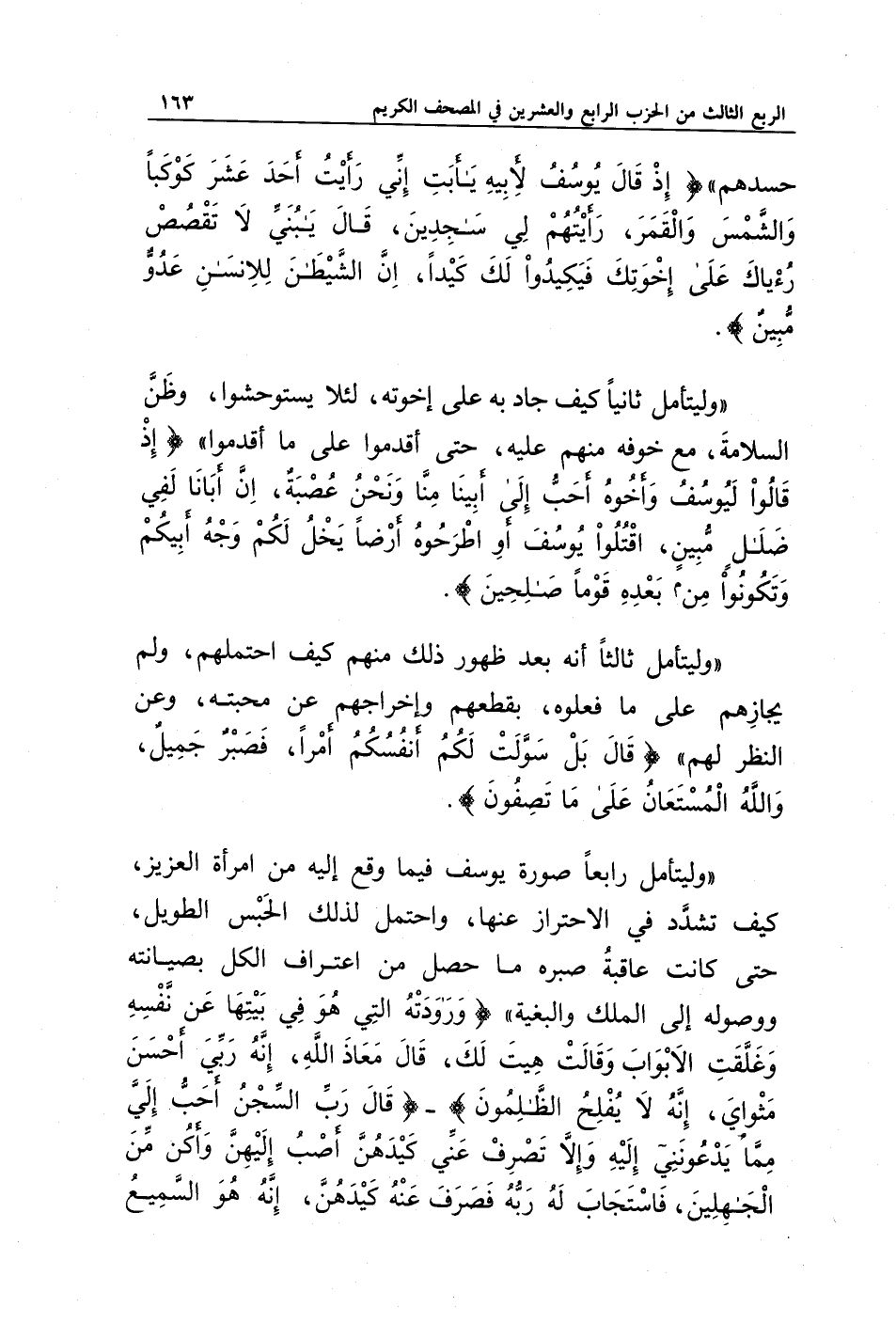 " وليتأمل رابعا صورة يوسف فيما وقع إليه من امرأة العزيز، كيف تشدد في الاحتراز عنها، واحتمل لذلك الحبس الطويل، حتى كانت عاقبة صبره ما حصل من اعتراف الكل بصيانته ووصوله إلى الملك والبغية " {وَرَاوَدَتْهُ الَّتِي هُوَ فِي بَيْتِهَا عَنْ نَفْسِهِ وَغَلَّقَتِ الْأَبْوَابَ وَقَالَتْ هَيْتَ لَكَ قَالَ مَعَاذَ اللَّهِ إِنَّهُ رَبِّي أَحْسَنَ مَثْوَايَ إِنَّهُ لَا يُفْلِحُ الظَّالِمُونَ} - {قَالَ رَبِّ السِّجْنُ أَحَبُّ إِلَيَّ مِمَّا يَدْعُونَنِي إِلَيْهِ وَإِلَّا تَصْرِفْ عَنِّي كَيْدَهُنَّ أَصْبُ إِلَيْهِنَّ وَأَكُنْ مِنَ الْجَاهِلِينَ * فَاسْتَجَابَ لَهُ رَبُّهُ فَصَرَفَ عَنْهُ كَيْدَهُنَّ إِنَّهُ هُوَ السَّمِيعُ