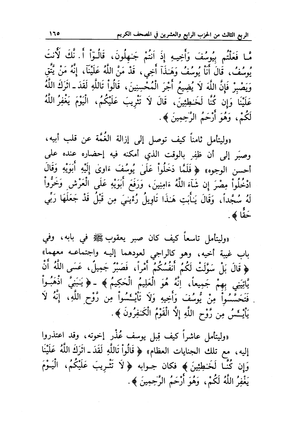 " وليتأمل تاسعا كيف كان صبر يعقوب صلى الله عليه وسلم في بابه، وفي باب غيبة أخيه، وهو كالراجي لعودهما إليه واجتماعه معهما " {قَالَ بَلْ سَوَّلَتْ لَكُمْ أَنْفُسُكُمْ أَمْرًا فَصَبْرٌ جَمِيلٌ عَسَى اللَّهُ أَنْ يَأْتِيَنِي بِهِمْ جَمِيعًا إِنَّهُ هُوَ الْعَلِيمُ الْحَكِيمُ} - {يَا بَنِيَّ اذْهَبُوا فَتَحَسَّسُوا مِنْ يُوسُفَ وَأَخِيهِ وَلَا تَيْأَسُوا مِنْ رَوْحِ اللَّهِ إِنَّهُ لَا يَيْأَسُ مِنْ رَوْحِ اللَّهِ إِلَّا الْقَوْمُ الْكَافِرُونَ}.