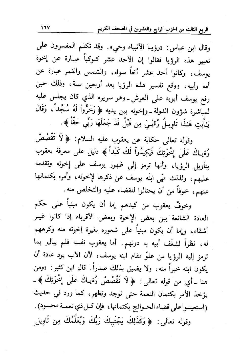 وقوله تعالى حكاية عن يعقوب عليه السلام: {لَا تَقْصُصْ رُؤْيَاكَ عَلَى إِخْوَتِكَ فَيَكِيدُوا لَكَ كَيْدًا} دليل على معرفة يعقوب بتأويل الرؤيا، وأنها ترمز إلى ظهور يوسف على إخوته وتقدمه عليهم، ولذلك نهى ابنه يوسف عن ذكرها لإخوته، وأمره بكتمانها عنهم، خوفا من أن يحتالوا للقضاء عليه والتخلص منه.