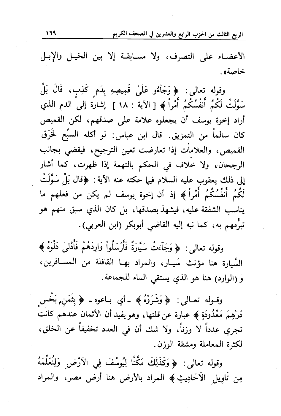 وقوله تعالى: {وَجَاءُوا عَلَى قَمِيصِهِ بِدَمٍ كَذِبٍ قَالَ بَلْ سَوَّلَتْ لَكُمْ أَنْفُسُكُمْ أَمْرًا} إشارة إلى الدم الذي أراد إخوة يوسف أن يجعلوه علامة على صدقهم، لكن القميص كان سالما من التمزيق. قال ابن عباس: لو أكله السبع لخرق القميص، والعلامات إذا تعارضت تعين الترجيح، فيقضي بجانب الرجحان، ولا خلاف في الحكم بالتهمة إذا ظهرت، كما أشار إلى ذلك يعقوب عليه السلام فيما حكته عنه الآية: {قَالَ بَلْ سَوَّلَتْ لَكُمْ أَنْفُسُكُمْ أَمْرًا} إذ أن إخوة يوسف لم يكن من فعلهم ما يناسب الشفقة عليه، فيشهد بصدقها، بل كان الذي سبق منهم هو تبرمهم به، كما نبه إليه القاضي أبو بكر (ابن العربي).