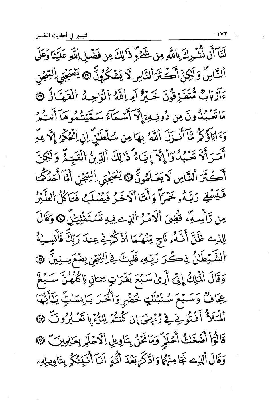لَنَا أَنْ نُشْرِكَ بِاللَّهِ مِنْ شَيْءٍ ذَلِكَ مِنْ فَضْلِ اللَّهِ عَلَيْنَا وَعَلَى النَّاسِ وَلَكِنَّ أَكْثَرَ النَّاسِ لَا يَشْكُرُونَ (38) يَا صَاحِبَيِ السِّجْنِ أَأَرْبَابٌ مُتَفَرِّقُونَ خَيْرٌ أَمِ اللَّهُ الْوَاحِدُ الْقَهَّارُ (39) مَا تَعْبُدُونَ مِنْ دُونِهِ إِلَّا أَسْمَاءً سَمَّيْتُمُوهَا أَنْتُمْ وَآبَاؤُكُمْ مَا أَنْزَلَ اللَّهُ بِهَا مِنْ سُلْطَانٍ إِنِ الْحُكْمُ إِلَّا لِلَّهِ أَمَرَ أَلَّا تَعْبُدُوا إِلَّا إِيَّاهُ ذَلِكَ الدِّينُ الْقَيِّمُ وَلَكِنَّ أَكْثَرَ النَّاسِ لَا يَعْلَمُونَ (40) يَا صَاحِبَيِ السِّجْنِ أَمَّا أَحَدُكُمَا فَيَسْقِي رَبَّهُ خَمْرًا وَأَمَّا الْآخَرُ فَيُصْلَبُ فَتَأْكُلُ الطَّيْرُ مِنْ رَأْسِهِ قُضِيَ الْأَمْرُ الَّذِي فِيهِ تَسْتَفْتِيَانِ (41) وَقَالَ لِلَّذِي ظَنَّ أَنَّهُ نَاجٍ مِنْهُمَا اذْكُرْنِي عِنْدَ رَبِّكَ فَأَنْسَاهُ الشَّيْطَانُ ذِكْرَ رَبِّهِ فَلَبِثَ فِي السِّجْنِ بِضْعَ سِنِينَ (42) وَقَالَ الْمَلِكُ إِنِّي أَرَى سَبْعَ بَقَرَاتٍ سِمَانٍ يَأْكُلُهُنَّ سَبْعٌ عِجَافٌ وَسَبْعَ سُنْبُلَاتٍ خُضْرٍ وَأُخَرَ يَابِسَاتٍ يَا أَيُّهَا الْمَلَأُ أَفْتُونِي فِي رُؤْيَايَ إِنْ كُنْتُمْ لِلرُّؤْيَا تَعْبُرُونَ (43) قَالُوا أَضْغَاثُ أَحْلَامٍ وَمَا نَحْنُ بِتَأْوِيلِ الْأَحْلَامِ بِعَالِمِينَ (44) وَقَالَ الَّذِي نَجَا مِنْهُمَا وَادَّكَرَ بَعْدَ أُمَّةٍ أَنَا أُنَبِّئُكُمْ بِتَأْوِيلِهِ