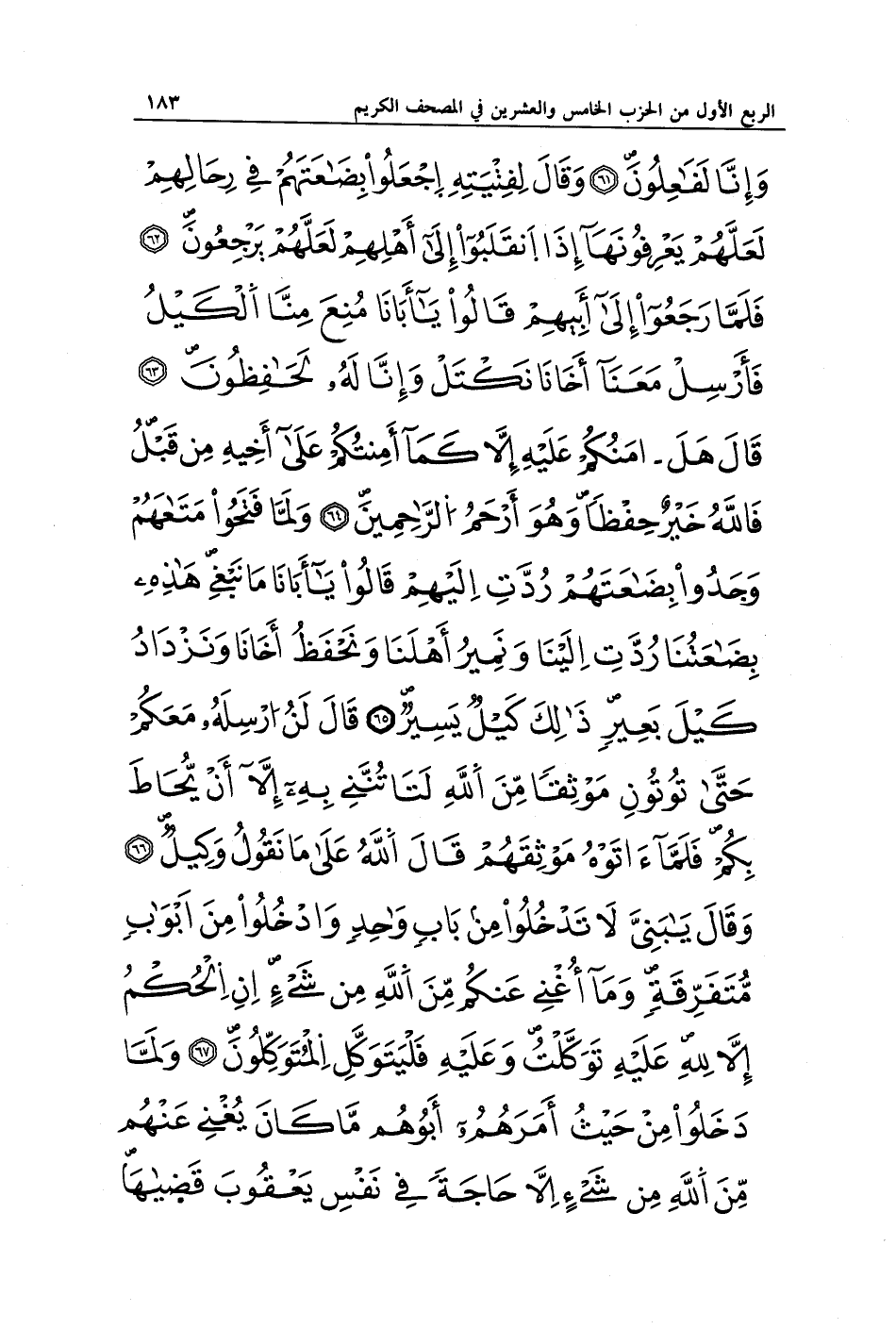 وَإِنَّا لَفَاعِلُونَ (61) وَقَالَ لِفِتْيَانِهِ اجْعَلُوا بِضَاعَتَهُمْ فِي رِحَالِهِمْ لَعَلَّهُمْ يَعْرِفُونَهَا إِذَا انْقَلَبُوا إِلَى أَهْلِهِمْ لَعَلَّهُمْ يَرْجِعُونَ (62) فَلَمَّا رَجَعُوا إِلَى أَبِيهِمْ قَالُوا يَا أَبَانَا مُنِعَ مِنَّا الْكَيْلُ فَأَرْسِلْ مَعَنَا أَخَانَا نَكْتَلْ وَإِنَّا لَهُ لَحَافِظُونَ (63) قَالَ هَلْ آمَنُكُمْ عَلَيْهِ إِلَّا كَمَا أَمِنْتُكُمْ عَلَى أَخِيهِ مِنْ قَبْلُ فَاللَّهُ خَيْرٌ حَافِظًا وَهُوَ أَرْحَمُ الرَّاحِمِينَ (64) وَلَمَّا فَتَحُوا مَتَاعَهُمْ وَجَدُوا بِضَاعَتَهُمْ رُدَّتْ إِلَيْهِمْ قَالُوا يَا أَبَانَا مَا نَبْغِي هَذِهِ بِضَاعَتُنَا رُدَّتْ إِلَيْنَا وَنَمِيرُ أَهْلَنَا وَنَحْفَظُ أَخَانَا وَنَزْدَادُ كَيْلَ بَعِيرٍ ذَلِكَ كَيْلٌ يَسِيرٌ (65) قَالَ لَنْ أُرْسِلَهُ مَعَكُمْ حَتَّى تُؤْتُونِ مَوْثِقًا مِنَ اللَّهِ لَتَأْتُنَّنِي بِهِ إِلَّا أَنْ يُحَاطَ بِكُمْ فَلَمَّا آتَوْهُ مَوْثِقَهُمْ قَالَ اللَّهُ عَلَى مَا نَقُولُ وَكِيلٌ (66) وَقَالَ يَا بَنِيَّ لَا تَدْخُلُوا مِنْ بَابٍ وَاحِدٍ وَادْخُلُوا مِنْ أَبْوَابٍ مُتَفَرِّقَةٍ وَمَا أُغْنِي عَنْكُمْ مِنَ اللَّهِ مِنْ شَيْءٍ إِنِ الْحُكْمُ إِلَّا لِلَّهِ عَلَيْهِ تَوَكَّلْتُ وَعَلَيْهِ فَلْيَتَوَكَّلِ الْمُتَوَكِّلُونَ (67) وَلَمَّا دَخَلُوا مِنْ حَيْثُ أَمَرَهُمْ أَبُوهُمْ مَا كَانَ يُغْنِي عَنْهُمْ مِنَ اللَّهِ مِنْ شَيْءٍ إِلَّا حَاجَةً فِي نَفْسِ يَعْقُوبَ قَضَاهَا
