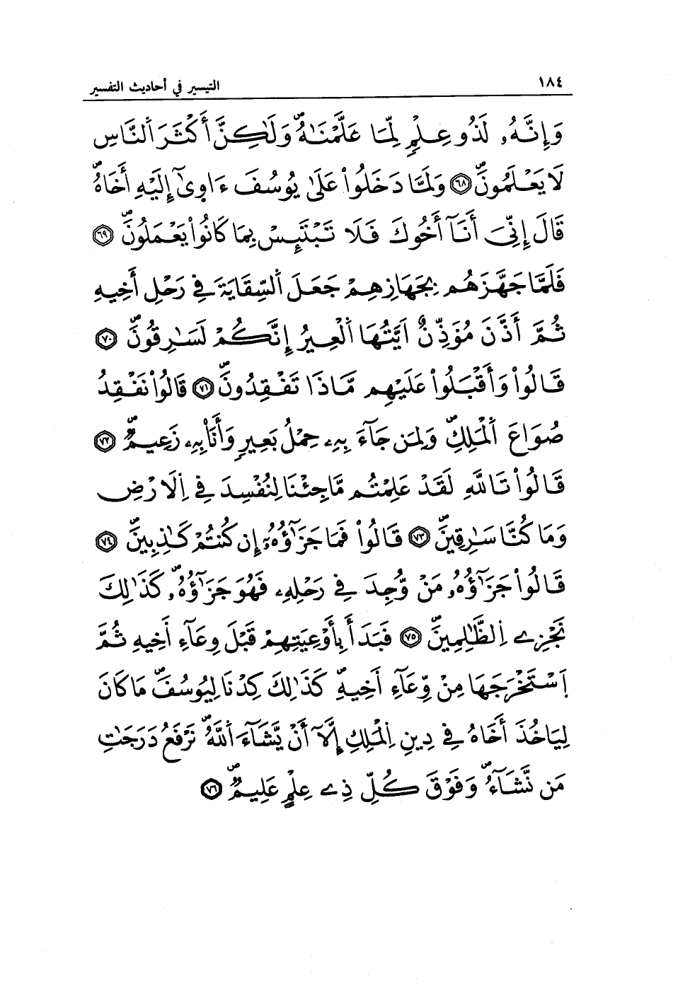 وَإِنَّهُ لَذُو عِلْمٍ لِمَا عَلَّمْنَاهُ وَلَكِنَّ أَكْثَرَ النَّاسِ لَا يَعْلَمُونَ (68) وَلَمَّا دَخَلُوا عَلَى يُوسُفَ آوَى إِلَيْهِ أَخَاهُ قَالَ إِنِّي أَنَا أَخُوكَ فَلَا تَبْتَئِسْ بِمَا كَانُوا يَعْمَلُونَ (69) فَلَمَّا جَهَّزَهُمْ بِجَهَازِهِمْ جَعَلَ السِّقَايَةَ فِي رَحْلِ أَخِيهِ ثُمَّ أَذَّنَ مُؤَذِّنٌ أَيَّتُهَا الْعِيرُ إِنَّكُمْ لَسَارِقُونَ (70) قَالُوا وَأَقْبَلُوا عَلَيْهِمْ مَاذَا تَفْقِدُونَ (71) قَالُوا نَفْقِدُ صُوَاعَ الْمَلِكِ وَلِمَنْ جَاءَ بِهِ حِمْلُ بَعِيرٍ وَأَنَا بِهِ زَعِيمٌ (72) قَالُوا تَاللَّهِ لَقَدْ عَلِمْتُمْ مَا جِئْنَا لِنُفْسِدَ فِي الْأَرْضِ وَمَا كُنَّا سَارِقِينَ (73) قَالُوا فَمَا جَزَاؤُهُ إِنْ كُنْتُمْ كَاذِبِينَ (74) قَالُوا جَزَاؤُهُ مَنْ وُجِدَ فِي رَحْلِهِ فَهُوَ جَزَاؤُهُ كَذَلِكَ نَجْزِي الظَّالِمِينَ (75) فَبَدَأَ بِأَوْعِيَتِهِمْ قَبْلَ وِعَاءِ أَخِيهِ ثُمَّ اسْتَخْرَجَهَا مِنْ وِعَاءِ أَخِيهِ كَذَلِكَ كِدْنَا لِيُوسُفَ مَا كَانَ لِيَأْخُذَ أَخَاهُ فِي دِينِ الْمَلِكِ إِلَّا أَنْ يَشَاءَ اللَّهُ نَرْفَعُ دَرَجَاتٍ مَنْ نَشَاءُ وَفَوْقَ كُلِّ ذِي عِلْمٍ عَلِيمٌ (76)