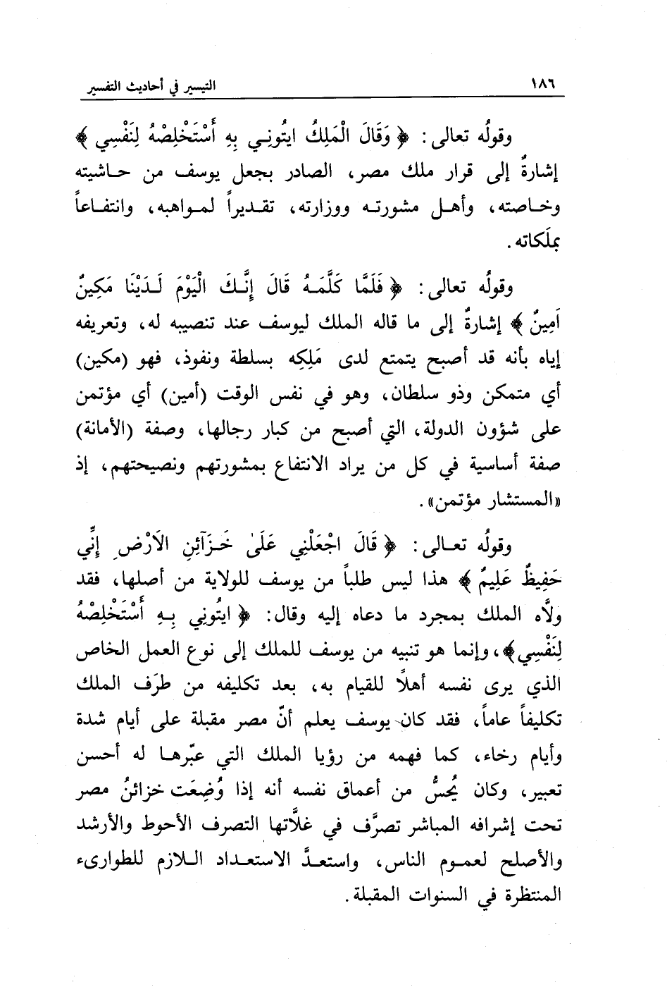 وقوله تعالى: {قَالَ اجْعَلْنِي عَلَى خَزَائِنِ الْأَرْضِ إِنِّي حَفِيظٌ عَلِيمٌ} هذا ليس طلبا من يوسف للولاية من أصلها، فقد ولاه الملك بمجرد ما دعاه إليه وقال: {ائْتُونِي بِهِ أَسْتَخْلِصْهُ لِنَفْسِي}، وإنما هو تنبيه من يوسف للملك إلى نوع العمل الخاص الذي يرى نفسه أهلا للقيام به، بعد تكليفه من طرف الملك تكليفا عاما، فقد كان يوسف يعلم أن مصر مقبلة على أيام شدة وأيام رخاء، كما فهمه من رؤيا الملك التي عبرها له أحسن تعبير، وكان يحس من أعماق نفسه أنه إذا وضعت خزائن مصر تحت إشرافه المباشر تصرف في غلاتها التصرف الأحوط والأرشد والأصلح لعموم الناس، واستعد الاستعداد اللازم للطوارئ المنتظرة في السنوات المقبلة.