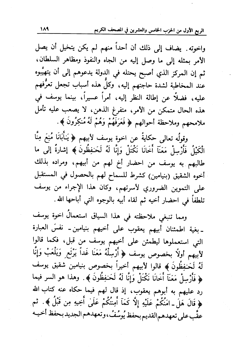 ومما تنبغي ملاحظته في هذا السياق استعمال إخوة يوسف - بغية اطمئنان أبيهم يعقوب على أخيهم بنيامين - نفس العبارة التي استعملوها ليطمئن على أخيهم يوسف من قبل، فكما قالوا لأبيهم أولا بخصوص يوسف {أَرْسِلْهُ مَعَنَا غَدًا يَرْتَعْ وَيَلْعَبْ وَإِنَّا لَهُ لَحَافِظُونَ} قالوا لأبيهم أخيرا بخصوص بنيامين شقيق يوسف {فَأَرْسِلْ مَعَنَا أَخَانَا نَكْتَلْ وَإِنَّا لَهُ لَحَافِظُونَ}. وهذا هو السر فيما رد عليهم به أبوهم يعقوب، إذ قال لهم فيما حكاه عنه كتاب الله {قَالَ هَلْ آمَنُكُمْ عَلَيْهِ إِلَّا كَمَا أَمِنْتُكُمْ عَلَى أَخِيهِ مِنْ قَبْلُ}. ثم عقب على تعهدهم القديم بحفظ يوسف، وتعهدهم الجديد بحفظ أخيه