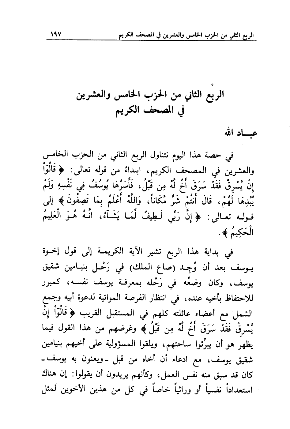 في حصة هذا اليوم نتناول الربع الثاني من الحزب الخامس والعشرين في المصحف الكريم، ابتداء من قوله تعالى: {قَالُوا إِنْ يَسْرِقْ فَقَدْ سَرَقَ أَخٌ لَهُ مِنْ قَبْلُ فَأَسَرَّهَا يُوسُفُ فِي نَفْسِهِ وَلَمْ يُبْدِهَا لَهُمْ قَالَ أَنْتُمْ شَرٌّ مَكَانًا وَاللَّهُ أَعْلَمُ بِمَا تَصِفُونَ} إلى قوله تعالى: {إِنَّ رَبِّي لَطِيفٌ لِمَا يَشَاءُ إِنَّهُ هُوَ الْعَلِيمُ الْحَكِيمُ}.