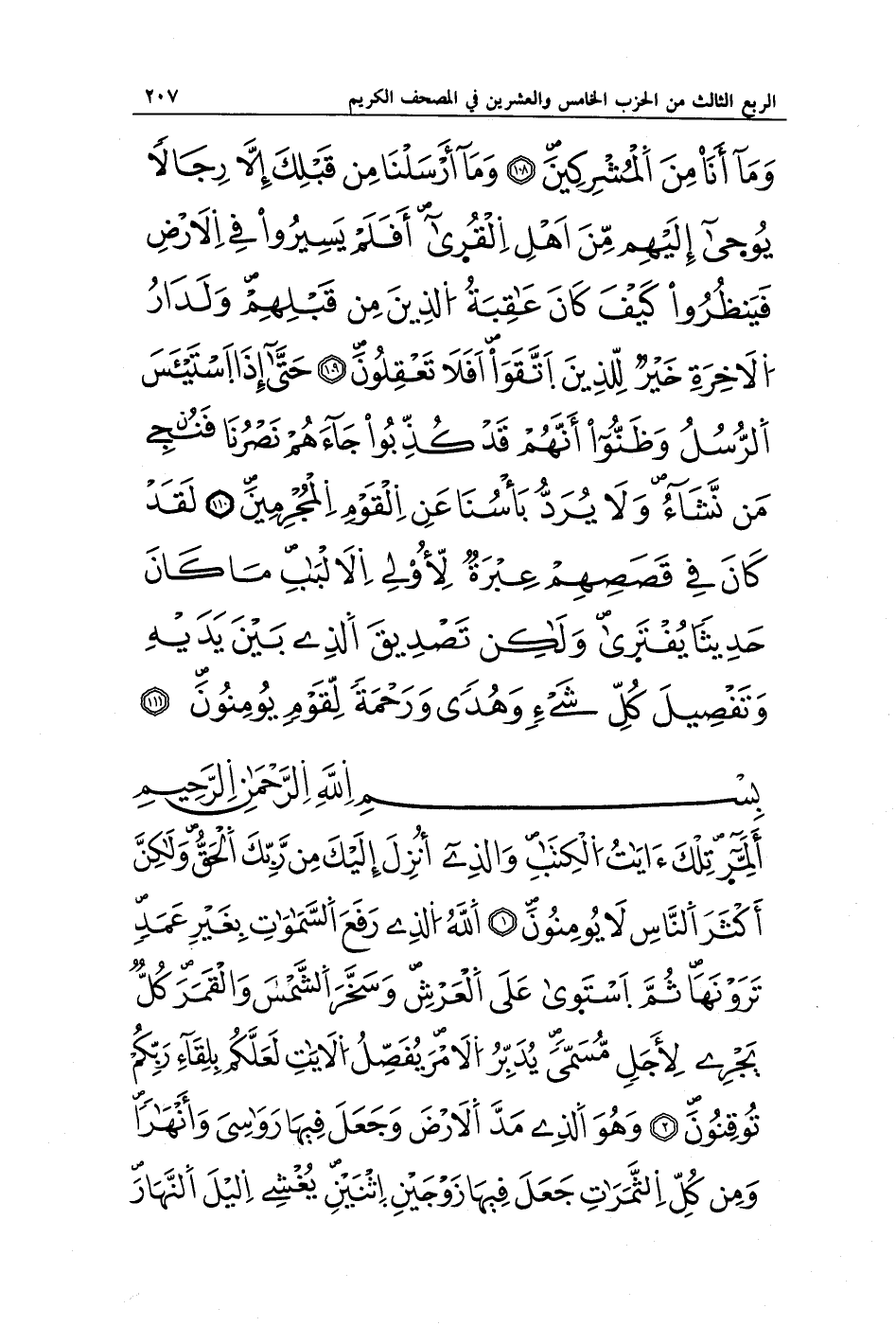المر تِلْكَ آيَاتُ الْكِتَابِ وَالَّذِي أُنْزِلَ إِلَيْكَ مِنْ رَبِّكَ الْحَقُّ وَلَكِنَّ أَكْثَرَ النَّاسِ لَا يُؤْمِنُونَ (1) اللَّهُ الَّذِي رَفَعَ السَّمَاوَاتِ بِغَيْرِ عَمَدٍ تَرَوْنَهَا ثُمَّ اسْتَوَى عَلَى الْعَرْشِ وَسَخَّرَ الشَّمْسَ وَالْقَمَرَ كُلٌّ يَجْرِي لِأَجَلٍ مُسَمًّى يُدَبِّرُ الْأَمْرَ يُفَصِّلُ الْآيَاتِ لَعَلَّكُمْ بِلِقَاءِ رَبِّكُمْ تُوقِنُونَ (2) وَهُوَ الَّذِي مَدَّ الْأَرْضَ وَجَعَلَ فِيهَا رَوَاسِيَ وَأَنْهَارًا وَمِنْ كُلِّ الثَّمَرَاتِ جَعَلَ فِيهَا زَوْجَيْنِ اثْنَيْنِ يُغْشِي اللَّيْلَ النَّهَارَ