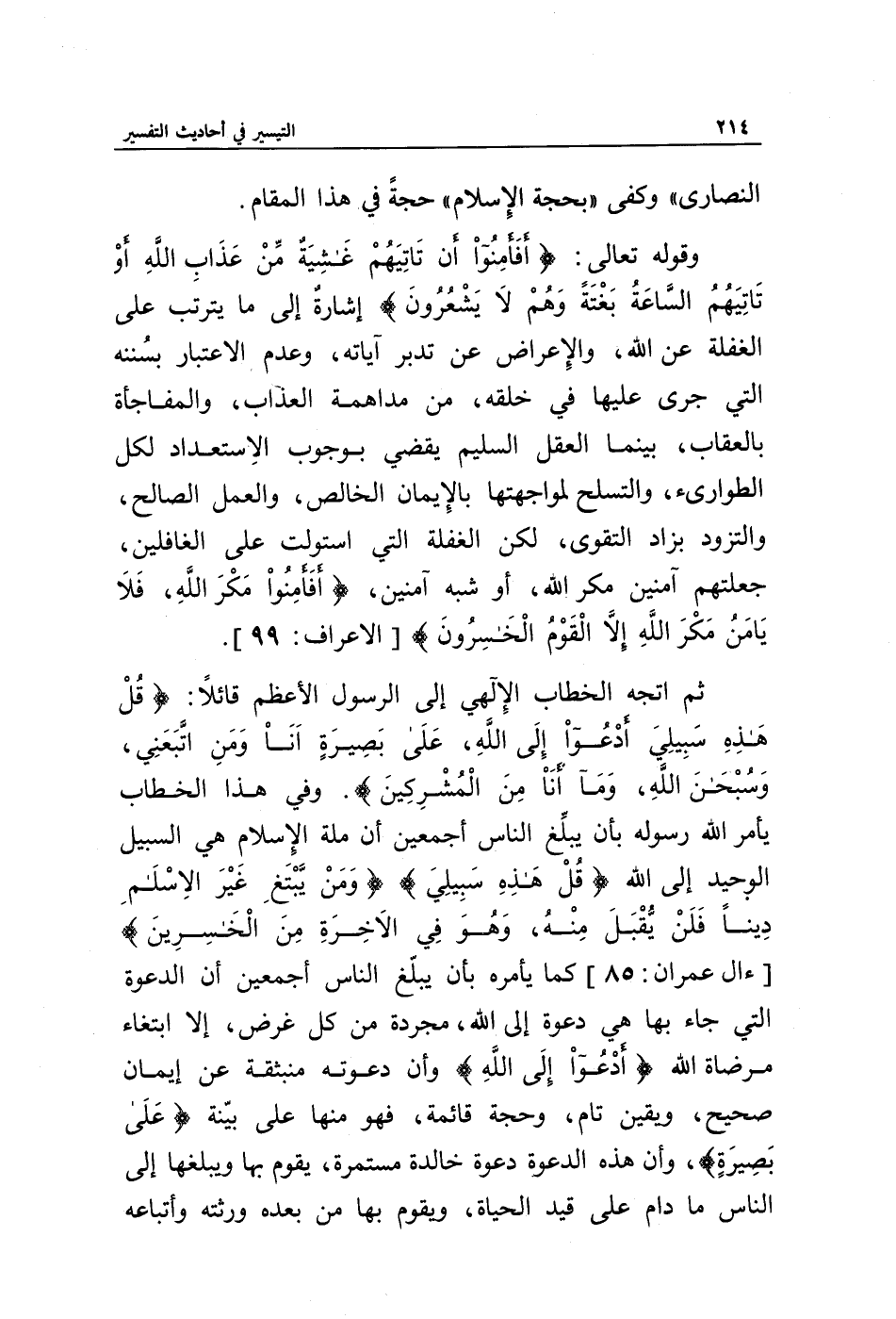 ثم اتجه الخطاب الإلهي إلى الرسول الأعظم قائلا: {قُلْ هَذِهِ سَبِيلِي أَدْعُو إِلَى اللَّهِ عَلَى بَصِيرَةٍ أَنَا وَمَنِ اتَّبَعَنِي وَسُبْحَانَ اللَّهِ وَمَا أَنَا مِنَ الْمُشْرِكِينَ}. وفي هذا الخطاب يأمر الله رسوله بأن يبلغ الناس أجمعين أن ملة الإسلام هي السبيل الوحيد إلى الله {قُلْ هَذِهِ سَبِيلِي} {وَمَنْ يَبْتَغِ غَيْرَ الْإِسْلَامِ دِينًا فَلَنْ يُقْبَلَ مِنْهُ وَهُوَ فِي الْآخِرَةِ مِنَ الْخَاسِرِينَ} [آل عمران: 85] كما أمره بأن يبلغ الناس أجمعين أن الدعوة التي جاء بها هي دعوة إلى الله، مجردة من كل غرض، إلا ابتغاء مرضاة الله {أَدْعُو إِلَى اللَّهِ} وأن دعوته منبثقة عن إيمان صحيح، ويقين تام، وحجة قائمة، فهو منها على بينة {عَلَى بَصِيرَةٍ}، وأن الدعوة خالدة مستمرة، يقوم بها ويبلغها إلى الناس ما دام على قيد الحياة، ويقوم بها من بعده ورثته وأتباعه