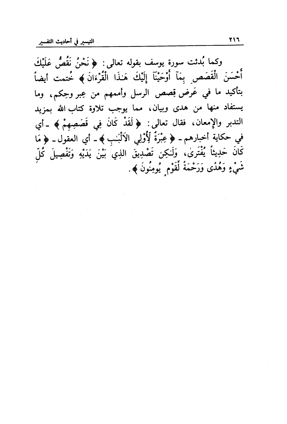 وكما بدئت سورة يوسف بقوله تعالى: {نَحْنُ نَقُصُّ عَلَيْكَ أَحْسَنَ الْقَصَصِ بِمَا أَوْحَيْنَا إِلَيْكَ هَذَا الْقُرْآنَ} ختمت أيضا بتأكيد ما في قصص الرسل وأممهم من هدى وبيان، مما يوجب تلاوة كتاب الله بمزيد التدبر والإمعان، فقال تعالى، {لَقَدْ كَانَ فِي قَصَصِهِمْ} - أي في حكاية أخبارهم - {عِبْرَةٌ لِأُولِي الْأَلْبَابِ} - أي العقول - {مَا كَانَ حَدِيثًا يُفْتَرَى وَلَكِنْ تَصْدِيقَ الَّذِي بَيْنَ يَدَيْهِ وَتَفْصِيلَ كُلِّ شَيْءٍ وَهُدًى وَرَحْمَةً لِقَوْمٍ يُؤْمِنُونَ}.