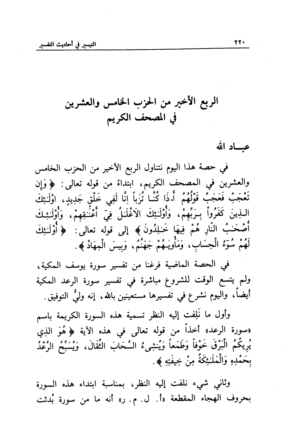 في حصة هذا اليوم نتناول الربع الأخير من الحزب الخامس والعشرين في المصحف الكريم، ابتداء من قوله تعالى: {وَإِنْ تَعْجَبْ فَعَجَبٌ قَوْلُهُمْ أَإِذَا كُنَّا تُرَابًا أَإِنَّا لَفِي خَلْقٍ جَدِيدٍ أُولَئِكَ الَّذِينَ كَفَرُوا بِرَبِّهِمْ وَأُولَئِكَ الْأَغْلَالُ فِي أَعْنَاقِهِمْ وَأُولَئِكَ أَصْحَابُ النَّارِ هُمْ فِيهَا خَالِدُونَ} إلى قوله تعالى: {أُولَئِكَ لَهُمْ سُوءُ الْحِسَابِ وَمَأْوَاهُمْ جَهَنَّمُ وَبِئْسَ الْمِهَادُ}.