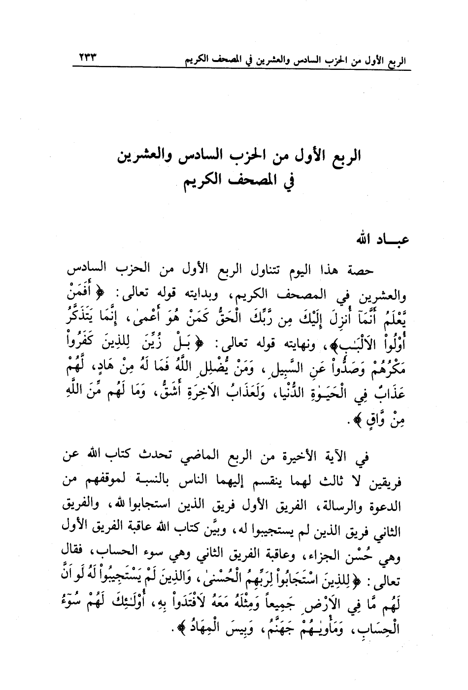 حصة هذا اليوم تتناول الربع الأول من الحزب السادس والعشرين في المصحف الكريم، وبداية قوله تعالى: {أَفَمَنْ يَعْلَمُ أَنَّمَا أُنْزِلَ إِلَيْكَ مِنْ رَبِّكَ الْحَقُّ كَمَنْ هُوَ أَعْمَى إِنَّمَا يَتَذَكَّرُ أُولُو الْأَلْبَابِ} ونهايته قوله تعالى: {بَلْ زُيِّنَ لِلَّذِينَ كَفَرُوا مَكْرُهُمْ وَصُدُّوا عَنِ السَّبِيلِ وَمَنْ يُضْلِلِ اللَّهُ فَمَا لَهُ مِنْ هَادٍ * لَهُمْ عَذَابٌ فِي الْحَيَاةِ الدُّنْيَا وَلَعَذَابُ الْآخِرَةِ أَشَقُّ وَمَا لَهُمْ مِنَ اللَّهِ مِنْ وَاقٍ}.