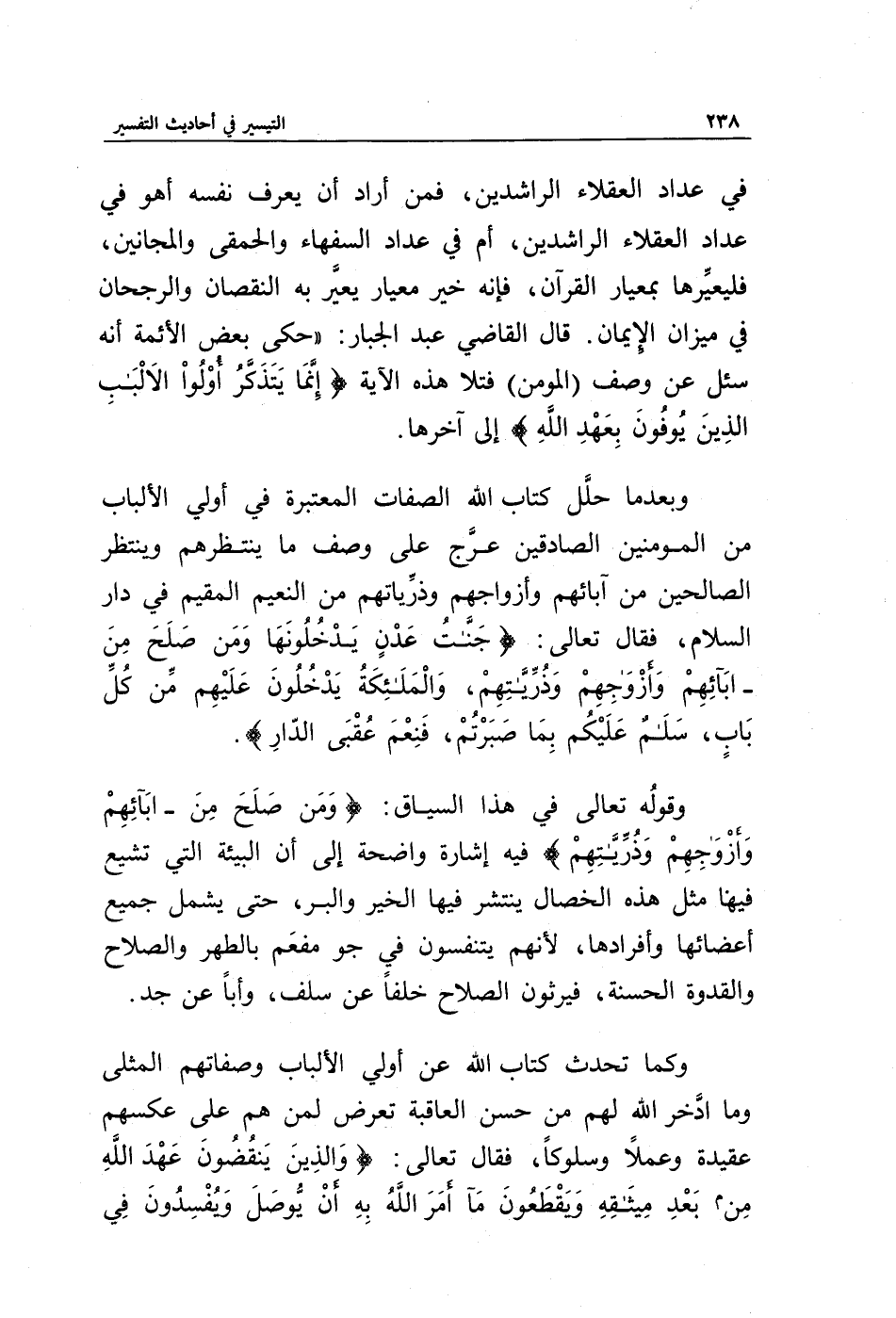 في عداد العقلاء الراشدين، فمن أراد أن يعرف نفسه أهو في عداد العقلاء الراشدين، أم في عداد السفهاء والحمقى والمجانين، فليعيرها بمعيار القرآن، فإنه خير معيار يعير به النقصان والرجحان في ميزان الإيمان. قال القاضي عبد الجبار: " حكى بعض الأئمة أنه سئل عن وصف {المؤمن} فتلا هذه الآية {إِنَّمَا يَتَذَكَّرُ أُولُو الْأَلْبَابِ * الَّذِينَ يُوفُونَ بِعَهْدِ اللَّهِ} إلى آخرها.