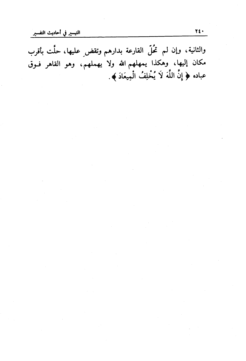والثانية، وإن لم تحل القارعة بدارهم وتقض عليها، حلت بأقرب مكان إليها، وهكذا يمهلهم الله ولا يهملهم، وهو القاهر فوق عباده {إِنَّ اللَّهَ لَا يُخْلِفُ الْمِيعَادَ}.