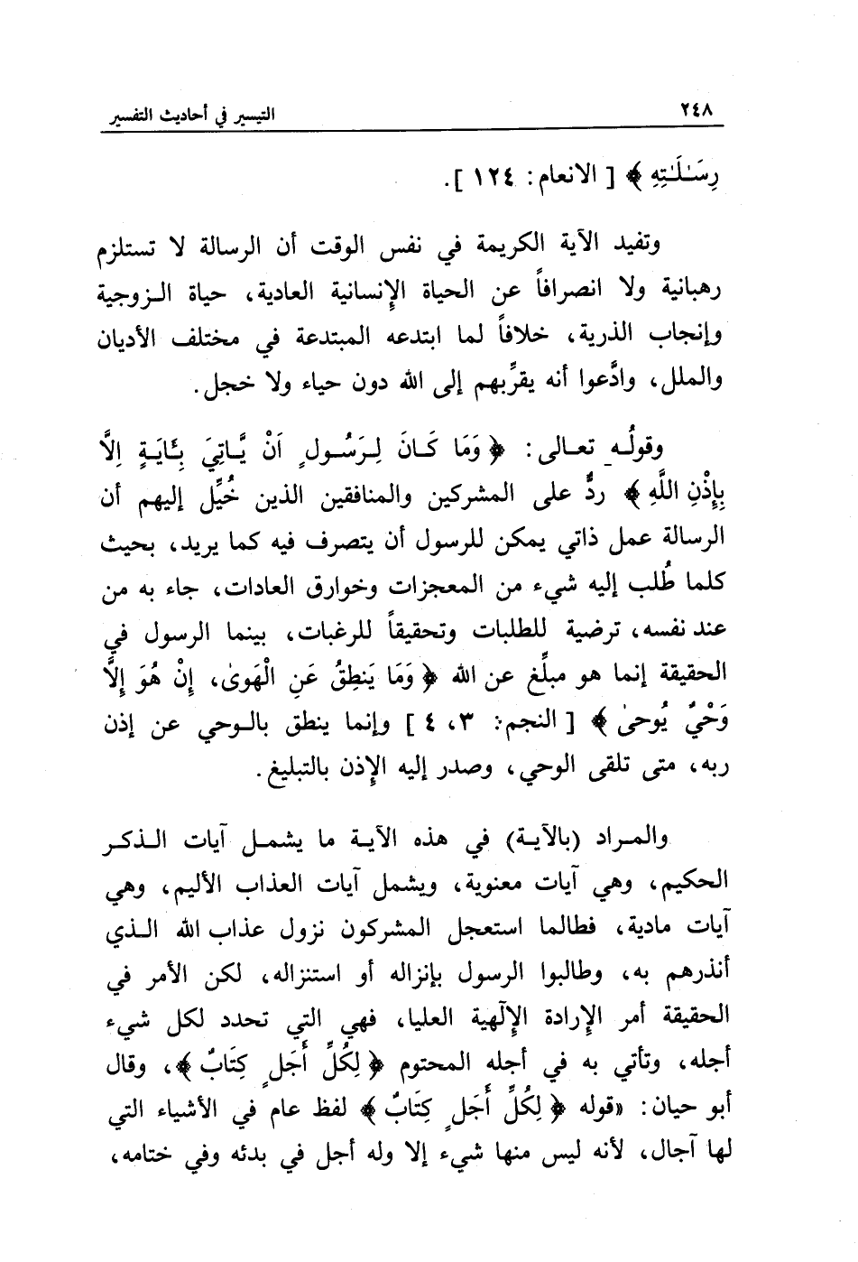 وقوله تعالى: {وَمَا كَانَ لِرَسُولٍ أَنْ يَأْتِيَ بِآيَةٍ إِلَّا بِإِذْنِ اللَّهِ} رد على المشركين والمنافقين الذين خيل إليهم أن الرسالة عمل ذاتي يمكن للرسول أن يتصرف فيه كما يريد، بحيث كلما طلب إليه شيء من المعجزات وخوارق العادات، جاء به من عند نفسه، ترضية للطلبات وتحقيقا للرغبات، بينما الرسول في الحقيقة إنما هو مبلغ عن الله {وَمَا يَنْطِقُ عَنِ الْهَوَى (3) إِنْ هُوَ إِلَّا وَحْيٌ يُوحَى} [النجم: 3، 4] وإنما ينطق بالوحي عن إذن ربه، متى تلقى الوحي، وصدر إليه الإذن بالتبليغ.