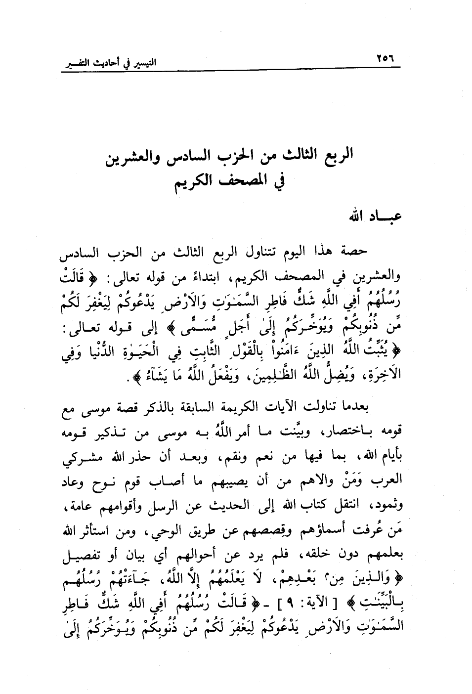 حصة هذا اليوم تتناول الربع الثالث من الحزب السادس والعشرين في المصحف الكريم، ابتاداء من قوله تعالى: {قَالَتْ رُسُلُهُمْ أَفِي اللَّهِ شَكٌّ فَاطِرِ السَّمَاوَاتِ وَالْأَرْضِ يَدْعُوكُمْ لِيَغْفِرَ لَكُمْ مِنْ ذُنُوبِكُمْ وَيُؤَخِّرَكُمْ إِلَى أَجَلٍ مُسَمًّى} إلى قوله تعالى: {يُثَبِّتُ اللَّهُ الَّذِينَ آمَنُوا بِالْقَوْلِ الثَّابِتِ فِي الْحَيَاةِ الدُّنْيَا وَفِي الْآخِرَةِ وَيُضِلُّ اللَّهُ الظَّالِمِينَ وَيَفْعَلُ اللَّهُ مَا يَشَاءُ}.