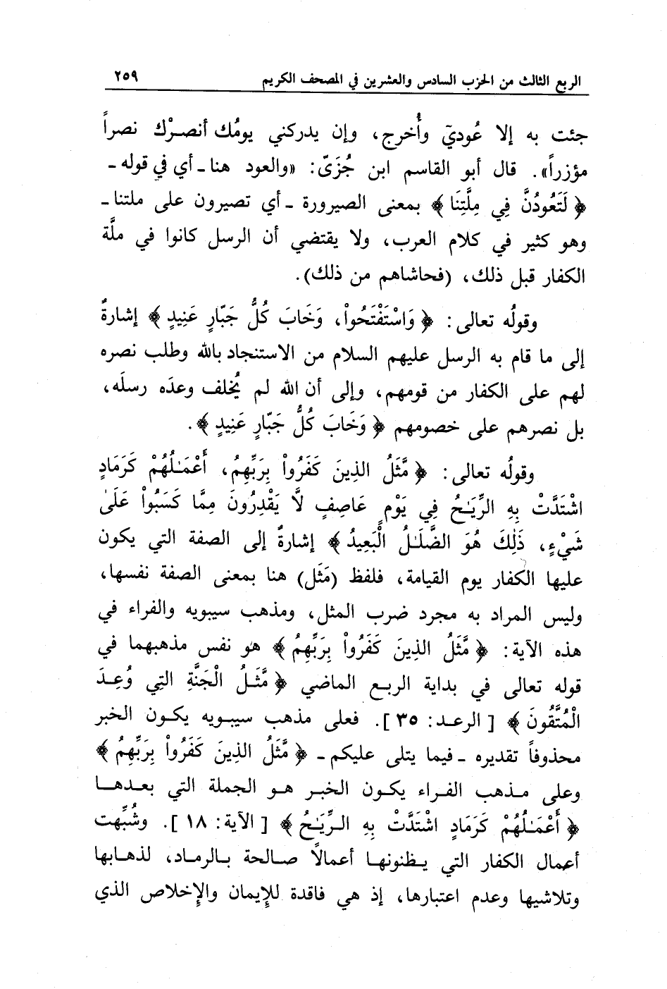 وقوله تعالى: {مَثَلُ الَّذِينَ كَفَرُوا بِرَبِّهِمْ أَعْمَالُهُمْ كَرَمَادٍ اشْتَدَّتْ بِهِ الرِّيحُ فِي يَوْمٍ عَاصِفٍ لَا يَقْدِرُونَ مِمَّا كَسَبُوا عَلَى شَيْءٍ ذَلِكَ هُوَ الضَّلَالُ الْبَعِيدُ} إشارة إلى الصفة التي يكون عليها الكفار يوم القيامة، فلفظ {مَثَلُ} هنا بمعنى الصفة نفسها، وليس المراد به مجرد ضرب المثل، ومذهب سيبويه والفراء في هذه الآية: {مَثَلُ الَّذِينَ كَفَرُوا بِرَبِّهِمْ} هو نفس مذهبهما في قوله تعالى في بداية الربع الماضي {مَثَلُ الْجَنَّةِ الَّتِي وُعِدَ الْمُتَّقُونَ} [الرعد: 35]. فعلى مذهب سيبويه يكون الخبر محذوفا تقديره -فيما يتلى عليكم- {مَثَلُ الَّذِينَ كَفَرُوا بِرَبِّهِمْ} وعلى مذهب الفراء يكون الخبر هو الجملة التي بعدها {أَعْمَالُهُمْ كَرَمَادٍ اشْتَدَّتْ بِهِ الرِّيحُ} [الآية: 18]. وشبهت أعمال الكفار التي يظنونها أعمالا صالحة بالرماد، لذهابها وتلاشيها وعدم اعتبارها، إذ هي فاقدة للإيمان والإخلاص الذي