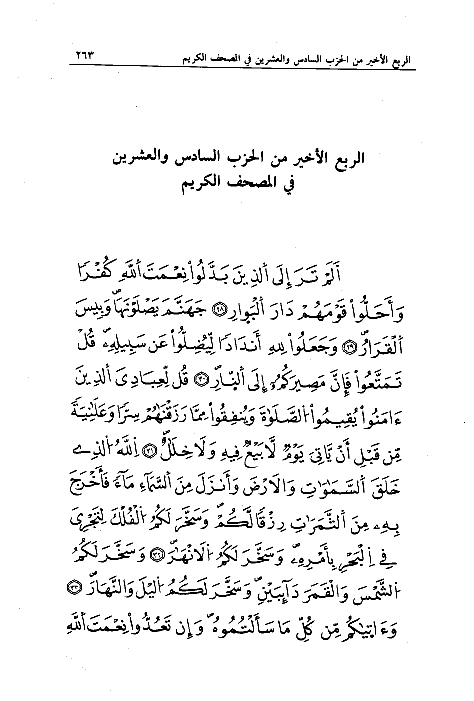 أَلَمْ تَرَ إِلَى الَّذِينَ بَدَّلُوا نِعْمَتَ اللَّهِ كُفْرًا وَأَحَلُّوا قَوْمَهُمْ دَارَ الْبَوَارِ (28) جَهَنَّمَ يَصْلَوْنَهَا وَبِئْسَ الْقَرَارُ (29) وَجَعَلُوا لِلَّهِ أَنْدَادًا لِيُضِلُّوا عَنْ سَبِيلِهِ قُلْ تَمَتَّعُوا فَإِنَّ مَصِيرَكُمْ إِلَى النَّارِ (30) قُلْ لِعِبَادِيَ الَّذِينَ آمَنُوا يُقِيمُوا الصَّلَاةَ وَيُنْفِقُوا مِمَّا رَزَقْنَاهُمْ سِرًّا وَعَلَانِيَةً مِنْ قَبْلِ أَنْ يَأْتِيَ يَوْمٌ لَا بَيْعٌ فِيهِ وَلَا خِلَالٌ (31) اللَّهُ الَّذِي خَلَقَ السَّمَاوَاتِ وَالْأَرْضَ وَأَنْزَلَ مِنَ السَّمَاءِ مَاءً فَأَخْرَجَ بِهِ مِنَ الثَّمَرَاتِ رِزْقًا لَكُمْ وَسَخَّرَ لَكُمُ الْفُلْكَ لِتَجْرِيَ فِي الْبَحْرِ بِأَمْرِهِ وَسَخَّرَ لَكُمُ الْأَنْهَارَ (32) وَسَخَّرَ لَكُمُ الشَّمْسَ وَالْقَمَرَ دَائِبَيْنِ وَسَخَّرَ لَكُمُ اللَّيْلَ وَالنَّهَارَ (33) وَآتَاكُمْ مِنْ كُلِّ مَا سَأَلْتُمُوهُ وَإِنْ تَعُدُّوا نِعْمَتَ اللَّهِ
