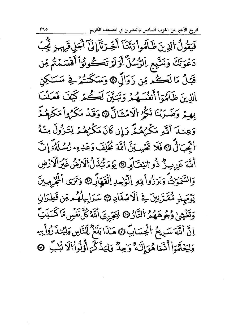 فَيَقُولُ الَّذِينَ ظَلَمُوا رَبَّنَا أَخِّرْنَا إِلَى أَجَلٍ قَرِيبٍ نُجِبْ دَعْوَتَكَ وَنَتَّبِعِ الرُّسُلَ أَوَلَمْ تَكُونُوا أَقْسَمْتُمْ مِنْ قَبْلُ مَا لَكُمْ مِنْ زَوَالٍ (44) وَسَكَنْتُمْ فِي مَسَاكِنِ الَّذِينَ ظَلَمُوا أَنْفُسَهُمْ وَتَبَيَّنَ لَكُمْ كَيْفَ فَعَلْنَا بِهِمْ وَضَرَبْنَا لَكُمُ الْأَمْثَالَ (45) وَقَدْ مَكَرُوا مَكْرَهُمْ وَعِنْدَ اللَّهِ مَكْرُهُمْ وَإِنْ كَانَ مَكْرُهُمْ لِتَزُولَ مِنْهُ الْجِبَالُ (46) فَلَا تَحْسَبَنَّ اللَّهَ مُخْلِفَ وَعْدِهِ رُسُلَهُ إِنَّ اللَّهَ عَزِيزٌ ذُو انْتِقَامٍ (47) يَوْمَ تُبَدَّلُ الْأَرْضُ غَيْرَ الْأَرْضِ وَالسَّمَاوَاتُ وَبَرَزُوا لِلَّهِ الْوَاحِدِ الْقَهَّارِ (48) وَتَرَى الْمُجْرِمِينَ يَوْمَئِذٍ مُقَرَّنِينَ فِي الْأَصْفَادِ (49) سَرَابِيلُهُمْ مِنْ قَطِرَانٍ وَتَغْشَى وُجُوهَهُمُ النَّارُ (50) لِيَجْزِيَ اللَّهُ كُلَّ نَفْسٍ مَا كَسَبَتْ إِنَّ اللَّهَ سَرِيعُ الْحِسَابِ (51) هَذَا بَلَاغٌ لِلنَّاسِ وَلِيُنْذَرُوا بِهِ وَلِيَعْلَمُوا أَنَّمَا هُوَ إِلَهٌ وَاحِدٌ وَلِيَذَّكَّرَ أُولُو الْأَلْبَابِ (52)