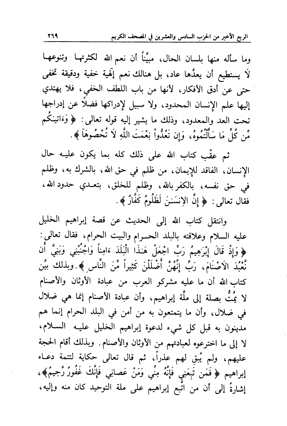 وانتقل كتاب الله إلى الحديث عن قصة إبراهيم الخليل عليه السلام وعلاقته بالبلد الحرام والبيت الحرام، فقال تعالى: {وَإِذْ قَالَ إِبْرَاهِيمُ رَبِّ اجْعَلْ هَذَا الْبَلَدَ آمِنًا وَاجْنُبْنِي وَبَنِيَّ أَنْ نَعْبُدَ الْأَصْنَامَ * رَبِّ إِنَّهُنَّ أَضْلَلْنَ كَثِيرًا مِنَ النَّاسِ}. وبذلك بين كتاب الله أن ما عليه مشركو العرب من عبادة الأوثان والأصنام لا يمت بصلة إلى ملة إبراهيم، وأن عبادة الأصنام إنما هي ضلال في ضلال، وأن ما يتمتعون به من أمن في البلد الحرام إنما هم مدينون به قبل كل شيء لدعوة إبراهيم الخليل عليه السلام، لا إلى ما اخترعوه لعبادتهم من الأوثان والأصنام. وبذلك أقام الحجة عليهم، ولم يبق لهم عذرا، ثم قال تعالى حكاية لتتمة دعاء إبراهيم {فَمَنْ تَبِعَنِي فَإِنَّهُ مِنِّي وَمَنْ عَصَانِي فَإِنَّكَ غَفُورٌ رَحِيمٌ}، إشارة إلى أن من اتبع إبراهيم على ملة التوحيد كان منه وإليه،