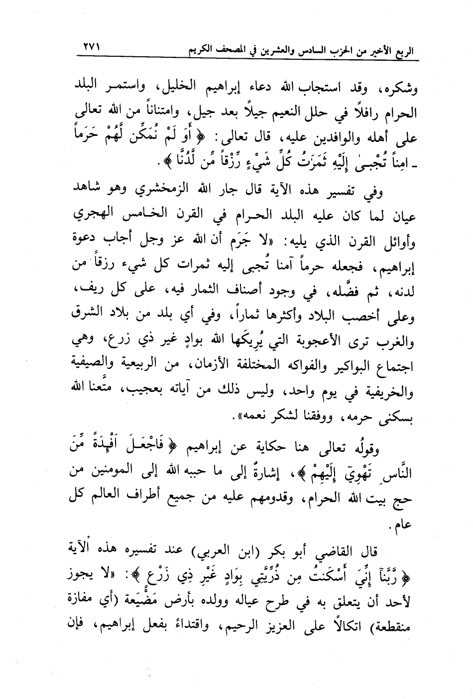وفي تفسير هذه الآية قال جار الله الزمخشري وهو شاهد عيان لما كان عليه البلد الحرام في القرن الخامس الهجري وأوائل القرن الذي يليه: " لا جرم أن الله عز وجل أجاب دعوة إبراهيم، فجعله حرما آمنا تجبى إليه ثمرات كل شيء رزقا من لدنه، ثم فضله، في وجود أصناف الثمار فيه، على كل ريف، وعلى أخصب البلاد وأكثرها ثمارا، وفي أي بلد من بلاد الشرق والغرب ترى الأعجوبة التي يريكها الله بواد غير ذي زرع، وهي اجتماع البواكير والفواكه المختلفة الأزمان، من الربيعية والصيفية والخريفية في يوم واحد، وليس ذلك من آياته بعجيب، متعنا الله بسكنى حرمه، ووفقنا لشكر نعمه ".
