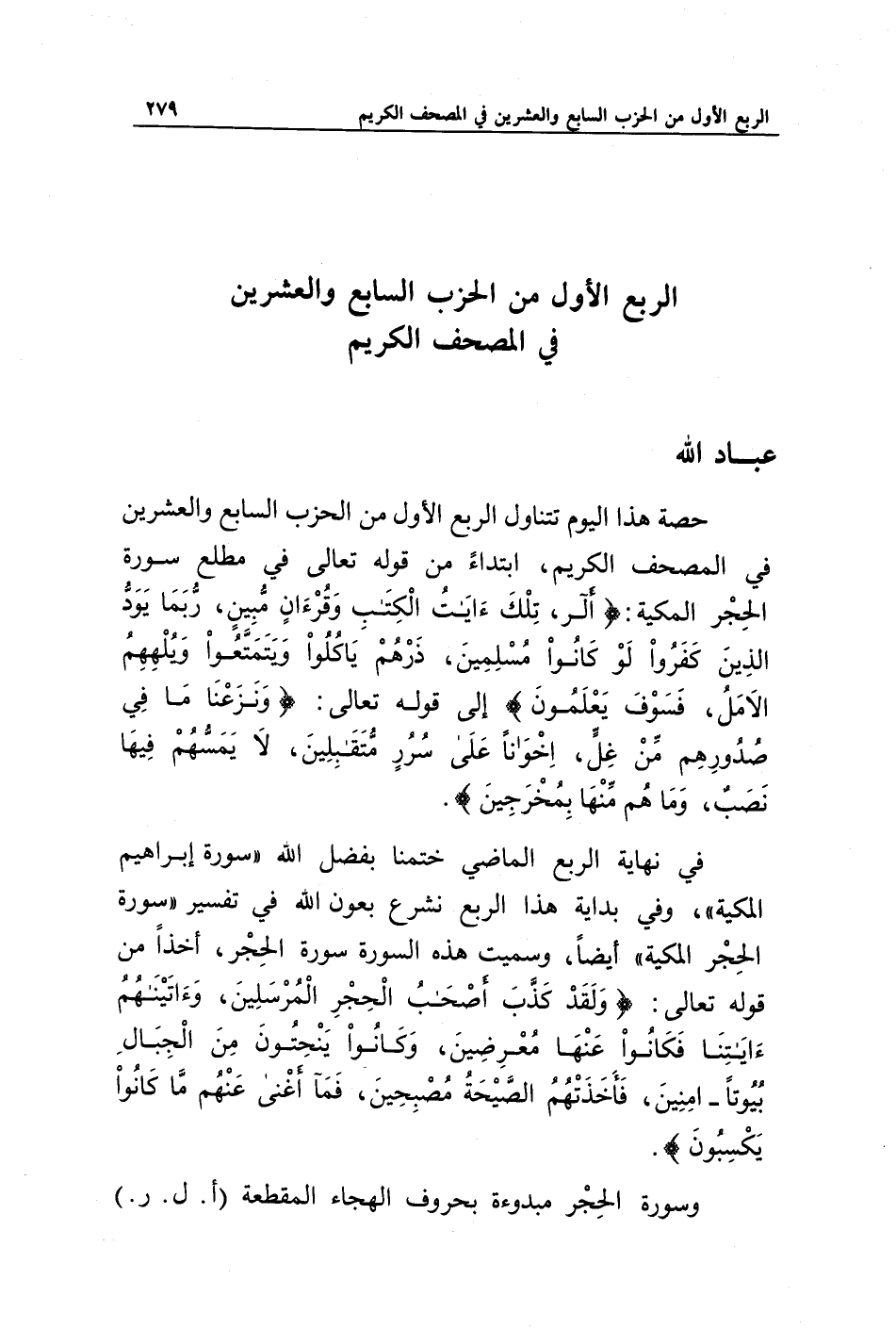 حصة هذا اليوم تتناول الربع الأول من الحزب السابع والعشرين في المصحف الكريم، ابتداء من قوله تعالى في مطلع سورة الحجر المكية: {الر تِلْكَ آيَاتُ الْكِتَابِ وَقُرْآنٍ مُبِينٍ} إلى قوله تعالى: {وَنَزَعْنَا مَا فِي صُدُورِهِمْ مِنْ غِلٍّ إِخْوَانًا عَلَى سُرُرٍ مُتَقَابِلِينَ * لَا يَمَسُّهُمْ فِيهَا نَصَبٌ وَمَا هُمْ مِنْهَا بِمُخْرَجِينَ}.
