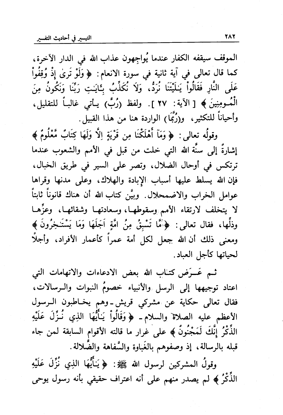 وقوله تعالى: {وَمَا أَهْلَكْنَا مِنْ قَرْيَةٍ إِلَّا وَلَهَا كِتَابٌ مَعْلُومٌ} إشارة إلى سنة الله التي خلت من قبل في الأمم والشعوب عندما ترتكس في أوحال الضلال، وتصر على السير في طريق الخبال، فإن الله يسلط عليها أسباب الإبادة والهلاك، وعلى مدنها وقراها عوامل الخراب والاضمحلال. وبين كتاب الله أن هناك قانونا ثابتا لا يتخلف لارتقاء الأمم وسقوطها، وسعادتها وشقائها، وعزها وذلها، فقال تعالى: {مَا تَسْبِقُ مِنْ أُمَّةٍ أَجَلَهَا وَمَا يَسْتَأْخِرُونَ} ومعنى ذلك أن الله جعل لكل أمة عمرا كأعمار الأفراد، وأجلا لحياتها كأجل العباد.