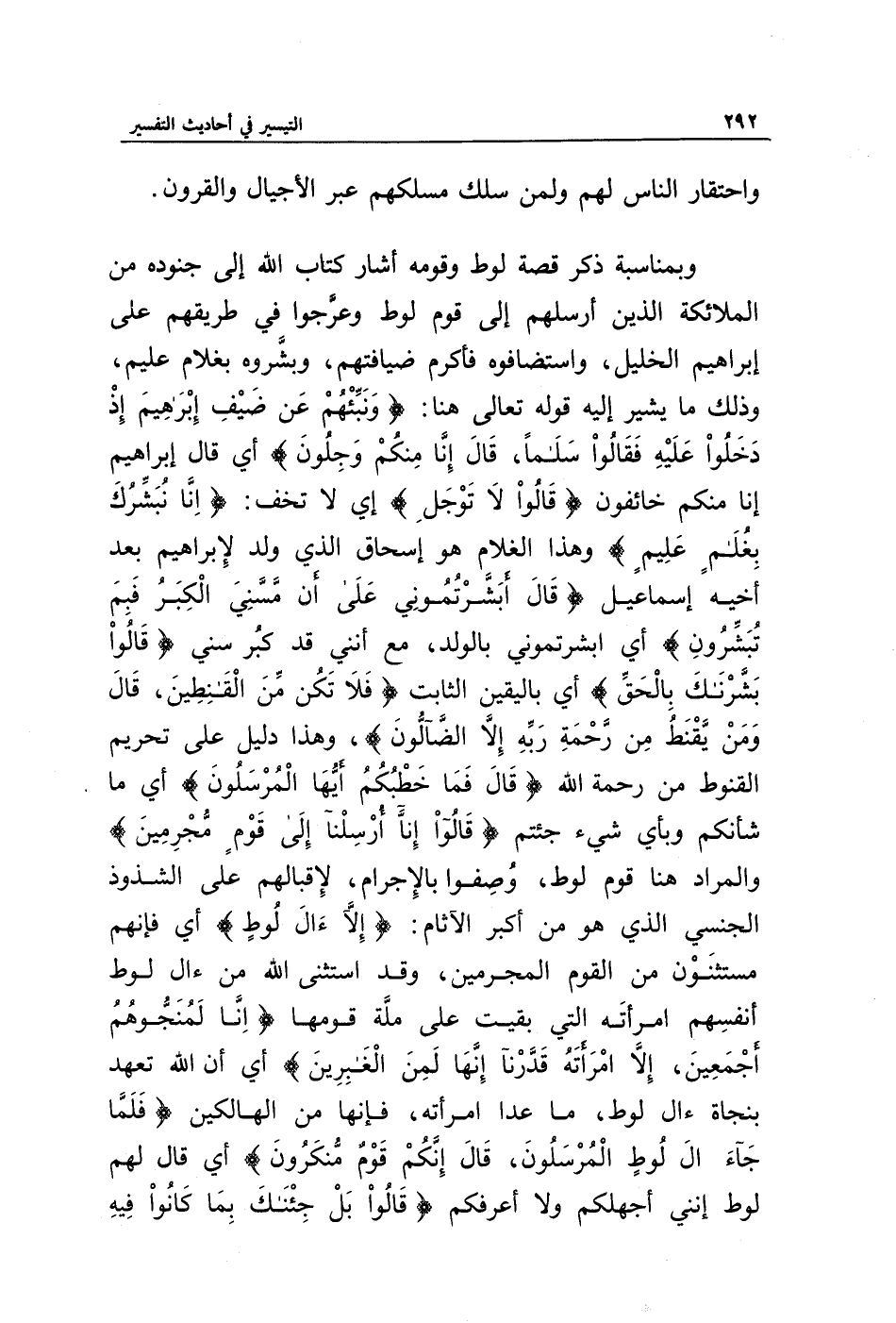 وبمناسبة ذكر قصة لوط وقومه أشار كتاب الله إلى جنوده من الملائكة الذين أرسلهم إلى قوم لوط وعرجوا في طريقهم على إبراهيم الخليل، واستضافوه فأكرم ضيافتهم، وبشروه بغلام عليم، وذلك ما يشير إليه قوله تعالى هنا: {وَنَبِّئْهُمْ عَنْ ضَيْفِ إِبْرَاهِيمَ * إِذْ دَخَلُوا عَلَيْهِ فَقَالُوا سَلَامًا قَالَ إِنَّا مِنْكُمْ وَجِلُونَ} أي قال إبراهيم إنا منكم خائفون {قَالُوا لَا تَوْجَلْ} أي لا تخف: {إِنَّا نُبَشِّرُكَ بِغُلَامٍ عَلِيمٍ} وهذا الغلام هو إسحاق الذي ولد لإبراهيم بعد أخيه إسماعيل {قَالَ أَبَشَّرْتُمُونِي عَلَى أَنْ مَسَّنِيَ الْكِبَرُ فَبِمَ تُبَشِّرُونَ} أي أبشرتموني بالولد، مع أنني قد كبر سني {قَالُوا بَشَّرْنَاكَ بِالْحَقِّ} أي باليقين الثابت {فَلَا تَكُنْ مِنَ الْقَانِطِينَ * قَالَ وَمَنْ يَقْنَطُ مِنْ رَحْمَةِ رَبِّهِ إِلَّا الضَّالُّونَ}، وهذا دليل على تحريم القنوط من رحمة الله {قَالَ فَمَا خَطْبُكُمْ أَيُّهَا الْمُرْسَلُونَ} أي ما شأنكم وبأي شيء جئتم {قَالُوا إِنَّا أُرْسِلْنَا إِلَى قَوْمٍ مُجْرِمِينَ} والمراد هنا قوم لوط، وصفوا بالإجرام، لإقبالهم على الشذوذ الجنسي الذي هو من أكبر الآثام: {إِلَّا آلَ لُوطٍ} أي فإنهم مستثنون من القوم المجرمين، وقد استثنى الله من آل لوط أنفسهم امرأته التي بقيت على ملة قومها {إِنَّا لَمُنَجُّوهُمْ أَجْمَعِينَ * إِلَّا امْرَأَتَهُ قَدَّرْنَا إِنَّهَا لَمِنَ الْغَابِرِينَ} أي أن الله تعهد بنجاة آل لوط، ما عدا امرأته فإنها من الهالكين {فَلَمَّا جَاءَ آلَ لُوطٍ الْمُرْسَلُونَ * قَالَ إِنَّكُمْ قَوْمٌ مُنْكَرُونَ} أي قال لهم لوط إنني أجهلكم ولا أعرفكم {قَالُوا بَلْ جِئْنَاكَ بِمَا كَانُوا فِيهِ