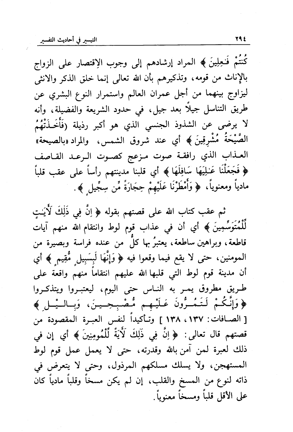 كُنْتُمْ فَاعِلِينَ} المراد إرشادهم إلى وجوب الاقتصار على الزواج بالإناث من قومه، وتذكيرهم بأن الله تعالى إنما خلق الذكر والأنثى ليزاوج بينهما من أجل عمران العالم واستمرار النوع البشري عن طريق التناسل جيلا بعد جيل، في حدود الشريعة والفضيلة، وأنه لا يرضى عن الشذوذ الجنسي الذي هو أكبر رذيلة {فَأَخَذَتْهُمُ الصَّيْحَةُ مُشْرِقِينَ} أي عند شروق الشمس، والمراد " بالصيحة " العذاب الذي رافقه صوت مزعج كصوت الرعد القاصف {فَجَعَلْنَا عَالِيَهَا سَافِلَهَا} أي قلبنا مدينتهم رأسا على عقب قلبا ماديا ومعنويا، {وَأَمْطَرْنَا عَلَيْهِمْ حِجَارَةً مِنْ سِجِّيلٍ}.