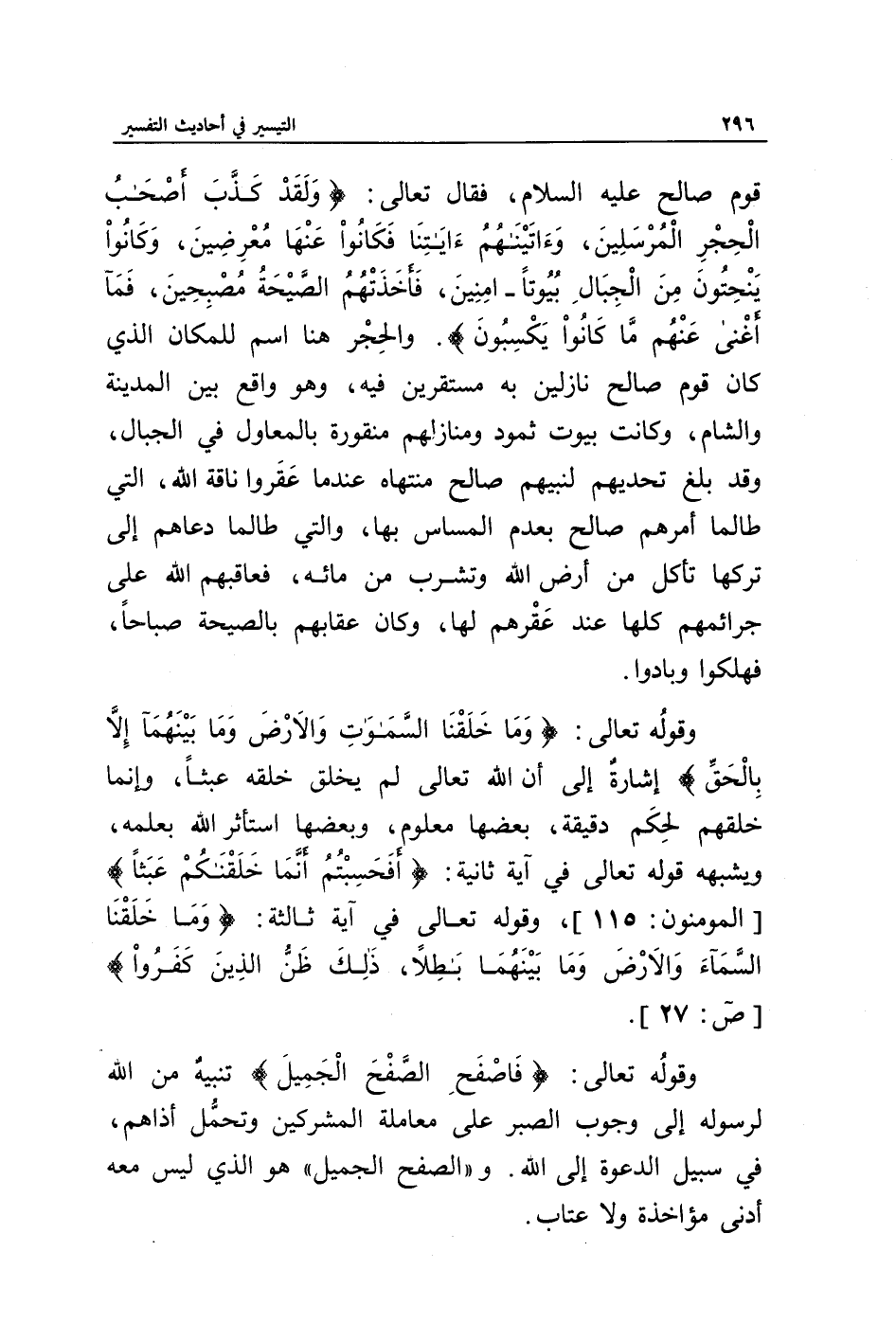 قوم صالح عليه السلام، فقال تعالى: {وَلَقَدْ كَذَّبَ أَصْحَابُ الْحِجْرِ الْمُرْسَلِينَ * وَآتَيْنَاهُمْ آيَاتِنَا فَكَانُوا عَنْهَا مُعْرِضِينَ * وَكَانُوا يَنْحِتُونَ مِنَ الْجِبَالِ بُيُوتًا آمِنِينَ * فَأَخَذَتْهُمُ الصَّيْحَةُ مُصْبِحِينَ * فَمَا أَغْنَى عَنْهُمْ مَا كَانُوا يَكْسِبُونَ}. والحجر هنا اسم للمكان الذي كان قوم صالح نازلين به مستقرين فيه، وهو واقع بين المدينة والشام، وكانت بيوت ثمود ومنازلهم منقورة بالمعاول في الجبال، وقد بلغ تحديهم لنبيهم صالح منتهاه عندما عقروا ناقة الله، التي طالما أمرهم صالح بعدم المساس بها، والتي طالما دعاهم إلى تركها تأكل من أرض الله وتشرب من مائه، فعاقبهم الله على جرائمهم كلها عند عقرهم لها، وكان عقابهم بالصيحة صباحا، فهلكوا وبادوا.
