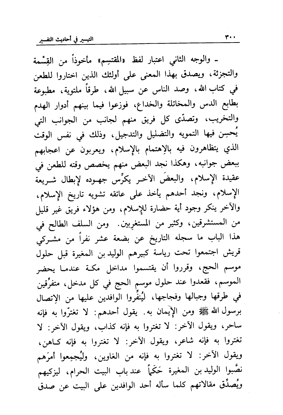 - الوجه الثاني اعتبار لفظ " المقتسم " مأخوذا من القسمة والتجزئة، ويصدق بهذا المعنى على أولئك الذين اختاروا للطعن في كتاب الله، وصد الناس عن سبيل الله، طرقا ملتوية، مطبوعة بطابع الدس والمخاتلة والخداع، فوزعوا فيما بينهم أدوار الهدم والتخريب، وتصدى كل فريق منهم لجانب من الجوانب التي يحسن فيها التمويه والتضليل والتدجيل، وذلك في نفس الوقت الذي يتظاهرون فيه بالاهتمام بالإسلام، ويعربون عن إعجابهم ببعض جوانبه، وهكذا نجد البعض منهم يخصص وقته للطعن في عقيدة الإسلام، والبعض الآخر يكرس جهوده لإبطال شريعة الإسلام، ونجد أحدهم يأخذ على عاتقه تشويه تاريخ الإسلام، والآخر ينكر وجود أية حضارة للإسلام، ومن هؤلاء فريق غير قليل من المستشرقين، وكثير من المستغربين. ومن السلف الطالح في هذا الباب ما سجله التاريخ عن بضعة عشر نفرا من مشركي قريش اجتمعوا تحت رياسة كبيرهم الوليد بن المغيرة قبل حلول موسم الحج، وقرروا أن يقتسموا مداخل مكة عندما يحضر الموسم، فقعدوا عند حلول موسم الحج في كل مدخل، متفرقين في طرقها وجبالها وفجاجها، لينفروا الوافدين عليها من الاتصال برسول الله صلى الله عليه وسلم ومن الإيمان به. يقول أحدهم: لا تغتروا به فإنه ساحر، ويقول الآخر: لا تغتروا به فإنه كذاب، ويقول الآخر: لا تغتروا به فإنه شاعر، ويقول الآخر لا تغتروا به فإنه كاهن، ويقول الآخر: لا تغتروا به فإنه من الغاوين، وليجمعوا أمرهم نصبوا الوليد بن المغيرة حكما عند باب البيت الحرام، ليزكيهم ويصدق مقالاتهم كلما سأله أحد الوافدين على البيت عن صدق