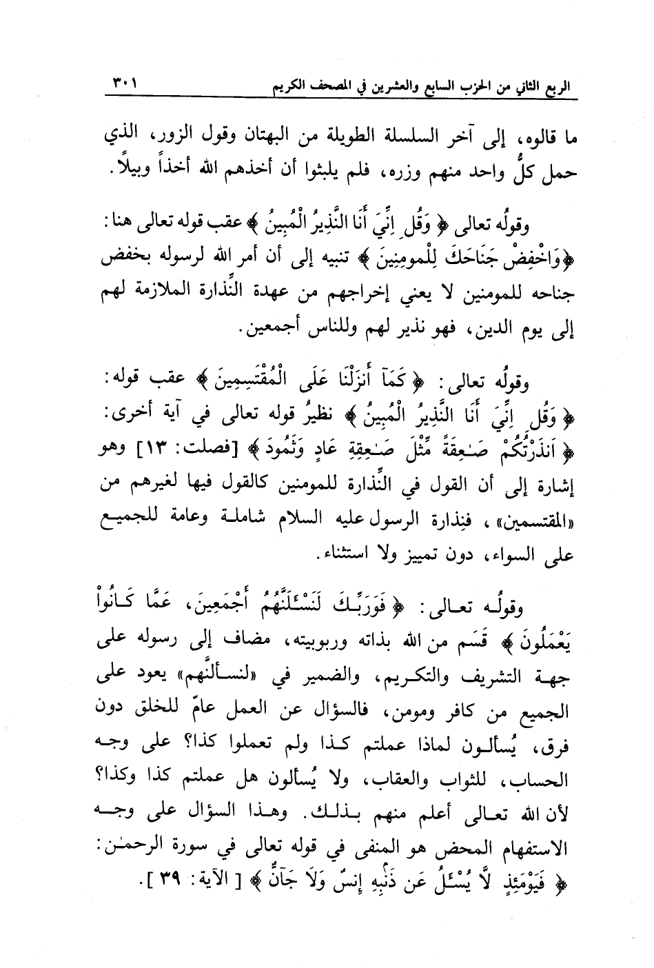 وقوله تعالى: {فَوَرَبِّكَ لَنَسْأَلَنَّهُمْ أَجْمَعِينَ * عَمَّا كَانُوا يَعْمَلُونَ} قسم من الله بذاته وربوبيته، مضاف إلى رسوله على جهة التشريف والتكريم، والضمير في " لنسألنهم " يعود على الجميع من كافر ومؤمن، فالسؤال عن العمل عام للخلق دون فرق، يسألون لماذا عملتم كذا ولم تعملوا كذا؟ على وجه الحساب، للثواب والعقاب، ولا يسألون هل عملتم كذا وكذا؟ لأن الله تعالى أعلم منهم بذلك، وهذا السؤال على وجه الاستفهام المحض هو المنفى في قوله تعالى في سورة الرحمان: {فَيَوْمَئِذٍ لَا يُسْأَلُ عَنْ ذَنْبِهِ إِنْسٌ وَلَا جَانٌّ} [الآية: 39].