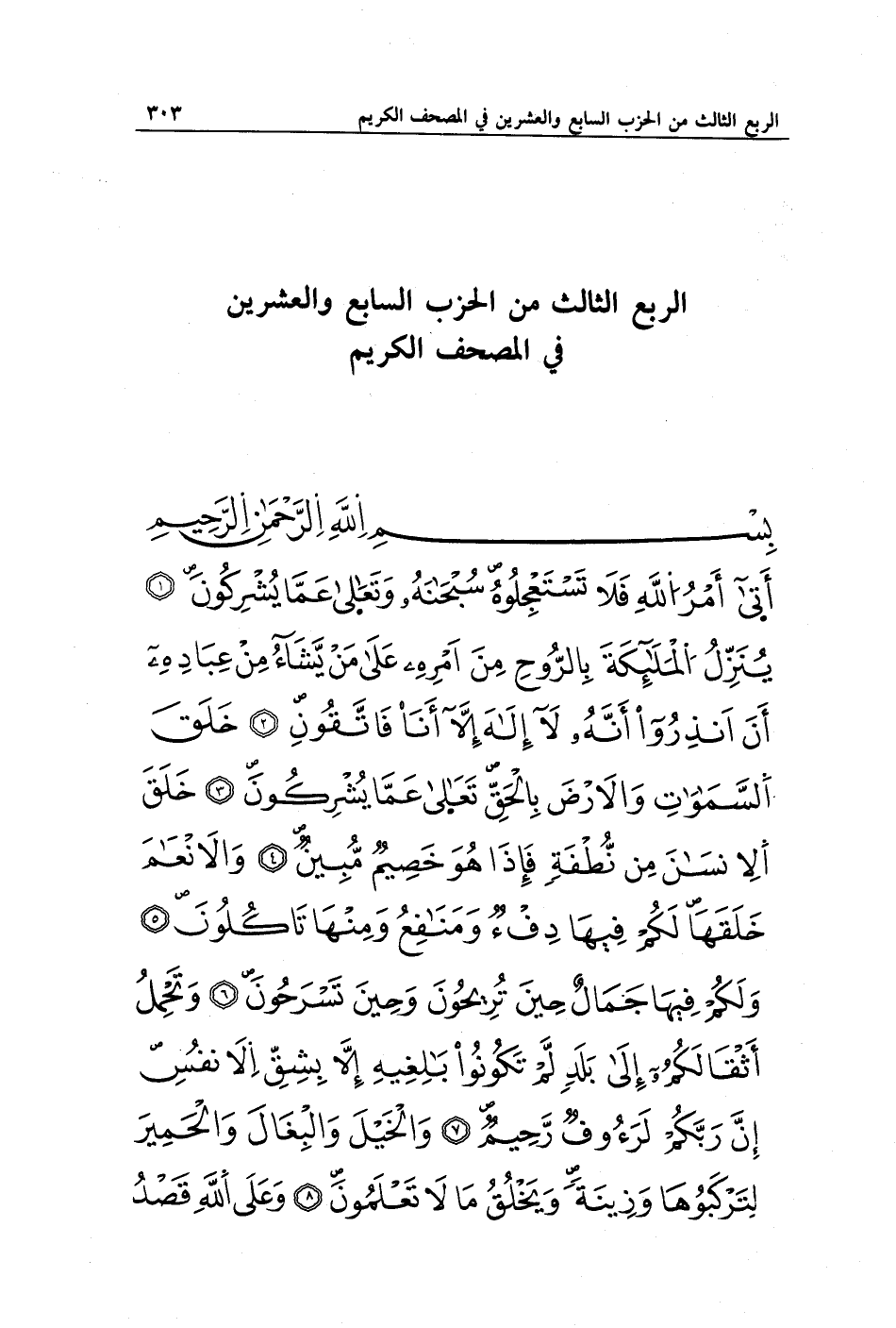 أَتَى أَمْرُ اللَّهِ فَلَا تَسْتَعْجِلُوهُ سُبْحَانَهُ وَتَعَالَى عَمَّا يُشْرِكُونَ (1) يُنَزِّلُ الْمَلَائِكَةَ بِالرُّوحِ مِنْ أَمْرِهِ عَلَى مَنْ يَشَاءُ مِنْ عِبَادِهِ أَنْ أَنْذِرُوا أَنَّهُ لَا إِلَهَ إِلَّا أَنَا فَاتَّقُونِ (2) خَلَقَ السَّمَاوَاتِ وَالْأَرْضَ بِالْحَقِّ تَعَالَى عَمَّا يُشْرِكُونَ (3) خَلَقَ الْإِنْسَانَ مِنْ نُطْفَةٍ فَإِذَا هُوَ خَصِيمٌ مُبِينٌ (4) وَالْأَنْعَامَ خَلَقَهَا لَكُمْ فِيهَا دِفْءٌ وَمَنَافِعُ وَمِنْهَا تَأْكُلُونَ (5) وَلَكُمْ فِيهَا جَمَالٌ حِينَ تُرِيحُونَ وَحِينَ تَسْرَحُونَ (6) وَتَحْمِلُ أَثْقَالَكُمْ إِلَى بَلَدٍ لَمْ تَكُونُوا بَالِغِيهِ إِلَّا بِشِقِّ الْأَنْفُسِ إِنَّ رَبَّكُمْ لَرَءُوفٌ رَحِيمٌ (7) وَالْخَيْلَ وَالْبِغَالَ وَالْحَمِيرَ لِتَرْكَبُوهَا وَزِينَةً وَيَخْلُقُ مَا لَا تَعْلَمُونَ (8) وَعَلَى اللَّهِ قَصْدُ