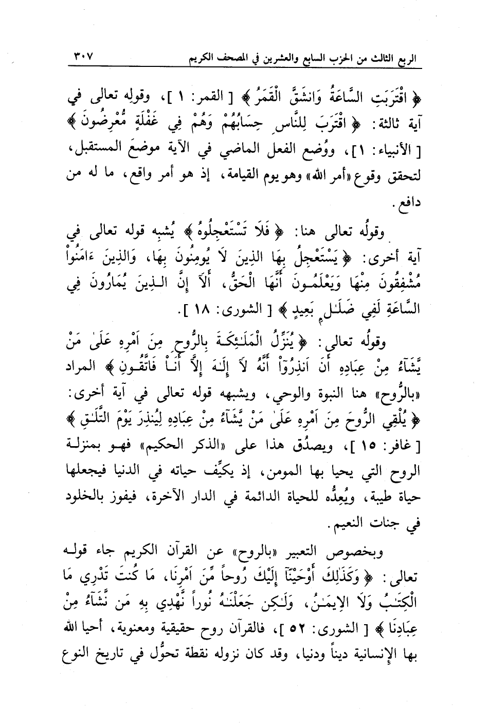 وبخصوص التعبير " بالروح " عن القرآن الكريم جاء قوله تعالى: {وَكَذَلِكَ أَوْحَيْنَا إِلَيْكَ رُوحًا مِنْ أَمْرِنَا مَا كُنْتَ تَدْرِي مَا الْكِتَابُ وَلَا الْإِيمَانُ وَلَكِنْ جَعَلْنَاهُ نُورًا نَهْدِي بِهِ مَنْ نَشَاءُ مِنْ عِبَادِنَا} [الشورى: 52]، فالقرآن روح حقيقية ومعنوية، أحيا الله بها الإنسانية دينا ودنيا، وقد كان نزوله نقطة تحول في تاريخ النوع