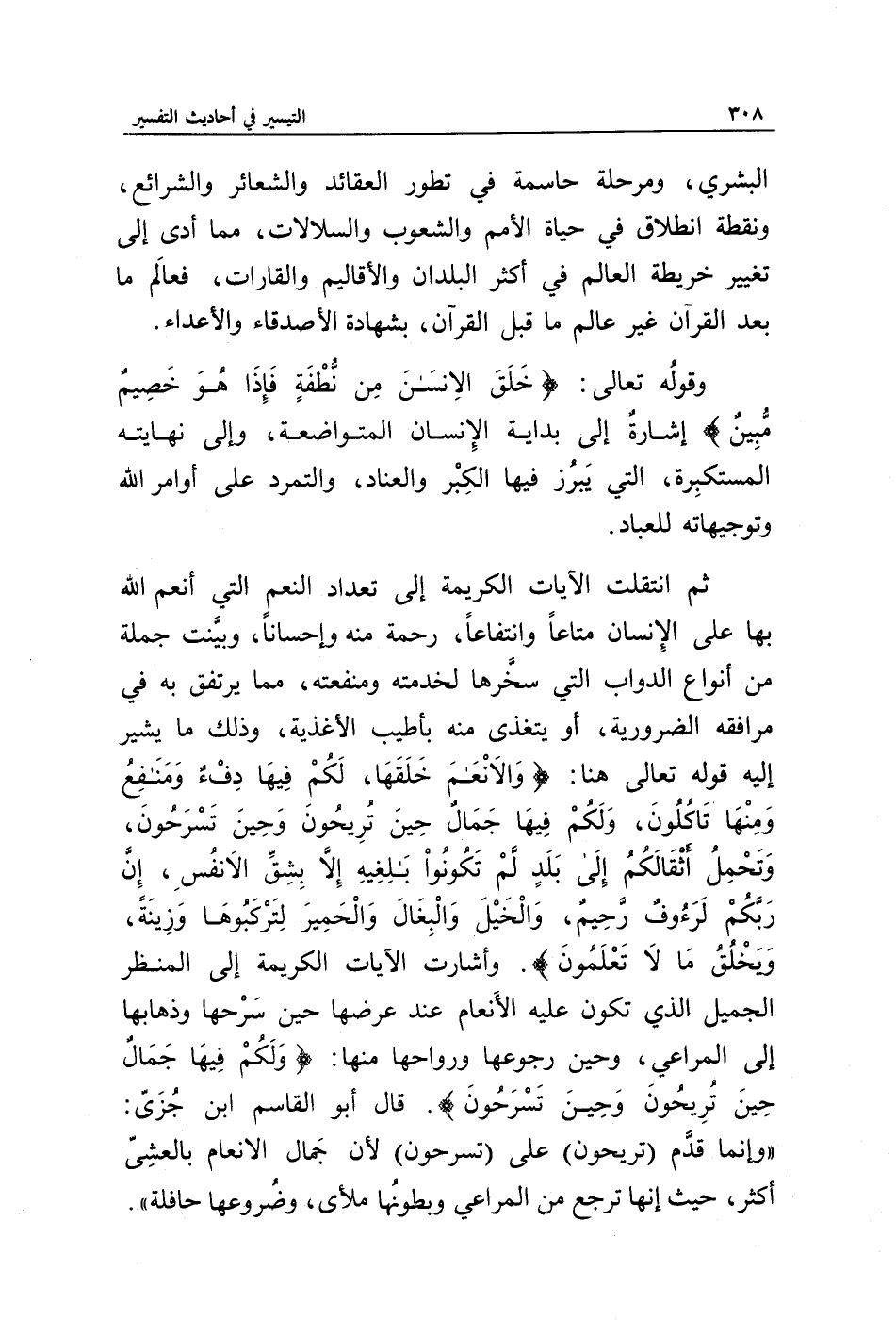 ثم انتقلت الآيات الكريمة إلى تعداد النعم التي أنعم الله بها على الإنسان متاعا وانتفاعا، رحمة منه وإحسانا، وبينت جملة من أنواع الدواب التي سخرها لخدمته ومنفعته، مما يرتفق به في مرافقه الضرورية، أو يتغذى منه بأطيب الأغذية، وذلك ما يشير إليه قوله تعالى هنا: {وَالْأَنْعَامَ خَلَقَهَا لَكُمْ فِيهَا دِفْءٌ وَمَنَافِعُ وَمِنْهَا تَأْكُلُونَ * وَلَكُمْ فِيهَا جَمَالٌ حِينَ تُرِيحُونَ وَحِينَ تَسْرَحُونَ * وَتَحْمِلُ أَثْقَالَكُمْ إِلَى بَلَدٍ لَمْ تَكُونُوا بَالِغِيهِ إِلَّا بِشِقِّ الْأَنْفُسِ إِنَّ رَبَّكُمْ لَرَءُوفٌ رَحِيمٌ * وَالْخَيْلَ وَالْبِغَالَ وَالْحَمِيرَ لِتَرْكَبُوهَا وَزِينَةً وَيَخْلُقُ مَا لَا تَعْلَمُونَ}. وأشارت الآيات الكريمة إلى المنظر الجميل الذي تكون عليه الأنعام عند عرضها حين سرحها وذهابها إلى المراعي، وحين رجوعها ورواحها منها: {وَلَكُمْ فِيهَا جَمَالٌ حِينَ تُرِيحُونَ وَحِينَ تَسْرَحُونَ}. قال أبو القاسم ابن جزي: " وإنما قدم {تُرِيحُونَ} على {تَسْرَحُونَ} لأن جمال الأنعام بالعشي أكثر، حيث أنها ترجع من المراعي وبطونها ملأى، وضروعها حافلة ".