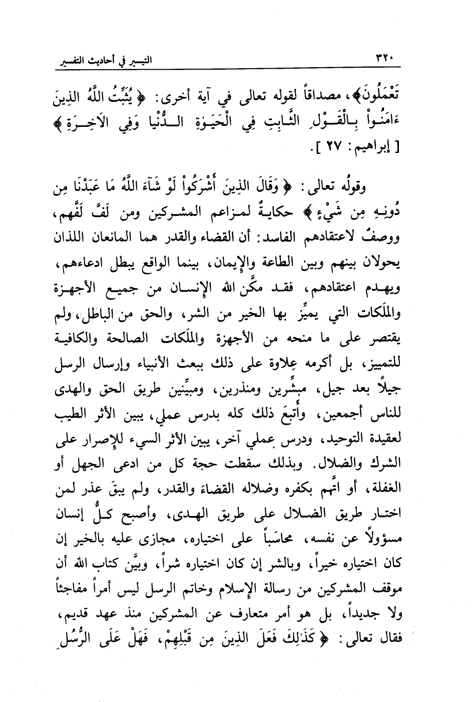 وقوله تعالى: {وَقَالَ الَّذِينَ أَشْرَكُوا لَوْ شَاءَ اللَّهُ مَا عَبَدْنَا مِنْ دُونِهِ مِنْ شَيْءٍ} حكاية لمزاعم المشركين ومن لف لفهم، ووصف لاعتقادهم الفاسد: إن القضاء والقدر هما المانعان اللذان يحولان بينهم وبين الطاعة والإيمان، بينما الواقع يبطل ادعاءهم، ويهدم اعتقادهم، فقد مكن الله الإنسان من جميع الأجهزة، والملكات التي يميز بها الخير من الشر، والحق من الباطل، ولم يقتصر على ما منحه من الأجهزة والملكات الصالحة والكافية للتمييز، بل أكرمه علاوة على ذلك ببعث الأنبياء وإرسال الرسل جيلا بعد جيل، مبشرين ومنذرين، ومبينين طريق الحق والهدى للناس أجمعين، وأتبع ذلك كله بدرس عملي، يبين الأثر الطيب لعقيدة التوحيد، ودرس عملي آخر، يبين الأثر السيئ للإصرار على الشرك والضلال. وبذلك سقطت حجة كل من ادعى الجهل أو الغفلة، أو اتهم بكفره وضلاله القضاء والقدر، ولم يبق عذر لمن اختار طريق الضلال على طريق الهدى، وأصبح كل إنسان مسؤولا عن نفسه، محاسبا على اختياره، مجازى عليه بالخير إن كان اختياره خيرا، وبالشر إن كان اختياره شرا، وبين كتاب الله أن موقف المشركين من رسالة الإسلام وخاتم الرسل ليس أمرا مفاجئا ولا جديدا، بل هو أمر متعارف عن المشركين منذ عهد قديم، فقال تعالى: {كَذَلِكَ فَعَلَ الَّذِينَ مِنْ قَبْلِهِمْ فَهَلْ عَلَى الرُّسُلِ