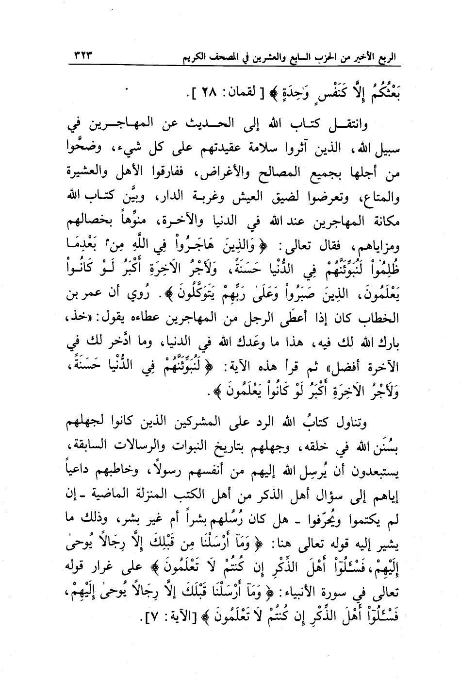 وانتقل كتاب الله إلى الحديث عن المهاجرين في سبيل الله، الذين آثروا سلامة عقيدتهم على كل شيء، وضحوا من أجلها بجميع المصالح والأغراض، ففارقوا الأهل والعشيرة والمتاع، وتعرضوا لضيق العيش وغربة الدار، وبين كتاب الله مكانة المهاجرين عند الله في الدنيا والآخرة، منوها بخصالهم ومزاياهم، فقال تعالى: {وَالَّذِينَ هَاجَرُوا فِي اللَّهِ مِنْ بَعْدِ مَا ظُلِمُوا لَنُبَوِّئَنَّهُمْ فِي الدُّنْيَا حَسَنَةً وَلَأَجْرُ الْآخِرَةِ أَكْبَرُ لَوْ كَانُوا يَعْلَمُونَ * الَّذِينَ صَبَرُوا وَعَلَى رَبِّهِمْ يَتَوَكَّلُونَ}. روي أن عمر بن الخطاب كان إذا أعطى الرجل من المهاجرين عطاءه يقول: " خذ، بارك الله لك فيه، هذا ما وعدك الله في الدنيا، وما ادخر لك في الآخرة أفضل " ثم قرأ هذه الآية: {لَنُبَوِّئَنَّهُمْ فِي الدُّنْيَا حَسَنَةً وَلَأَجْرُ الْآخِرَةِ أَكْبَرُ لَوْ كَانُوا يَعْلَمُونَ}.