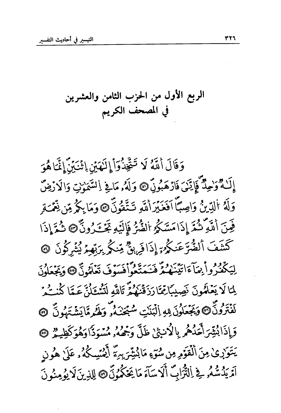 وَقَالَ اللَّهُ لَا تَتَّخِذُوا إِلَهَيْنِ اثْنَيْنِ إِنَّمَا هُوَ إِلَهٌ وَاحِدٌ فَإِيَّايَ فَارْهَبُونِ (51) وَلَهُ مَا فِي السَّمَاوَاتِ وَالْأَرْضِ وَلَهُ الدِّينُ وَاصِبًا أَفَغَيْرَ اللَّهِ تَتَّقُونَ (52) وَمَا بِكُمْ مِنْ نِعْمَةٍ فَمِنَ اللَّهِ ثُمَّ إِذَا مَسَّكُمُ الضُّرُّ فَإِلَيْهِ تَجْأَرُونَ (53) ثُمَّ إِذَا كَشَفَ الضُّرَّ عَنْكُمْ إِذَا فَرِيقٌ مِنْكُمْ بِرَبِّهِمْ يُشْرِكُونَ (54) لِيَكْفُرُوا بِمَا آتَيْنَاهُمْ فَتَمَتَّعُوا فَسَوْفَ تَعْلَمُونَ (55) وَيَجْعَلُونَ لِمَا لَا يَعْلَمُونَ نَصِيبًا مِمَّا رَزَقْنَاهُمْ تَاللَّهِ لَتُسْأَلُنَّ عَمَّا كُنْتُمْ تَفْتَرُونَ (56) وَيَجْعَلُونَ لِلَّهِ الْبَنَاتِ سُبْحَانَهُ وَلَهُمْ مَا يَشْتَهُونَ (57) وَإِذَا بُشِّرَ أَحَدُهُمْ بِالْأُنْثَى ظَلَّ وَجْهُهُ مُسْوَدًّا وَهُوَ كَظِيمٌ (58) يَتَوَارَى مِنَ الْقَوْمِ مِنْ سُوءِ مَا بُشِّرَ بِهِ أَيُمْسِكُهُ عَلَى هُونٍ أَمْ يَدُسُّهُ فِي التُّرَابِ أَلَا سَاءَ مَا يَحْكُمُونَ (59) لِلَّذِينَ لَا يُؤْمِنُونَ