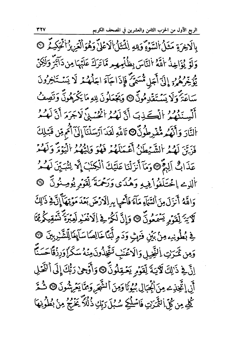 بِالْآخِرَةِ مَثَلُ السَّوْءِ وَلِلَّهِ الْمَثَلُ الْأَعْلَى وَهُوَ الْعَزِيزُ الْحَكِيمُ (60) وَلَوْ يُؤَاخِذُ اللَّهُ النَّاسَ بِظُلْمِهِمْ مَا تَرَكَ عَلَيْهَا مِنْ دَابَّةٍ وَلَكِنْ يُؤَخِّرُهُمْ إِلَى أَجَلٍ مُسَمًّى فَإِذَا جَاءَ أَجَلُهُمْ لَا يَسْتَأْخِرُونَ سَاعَةً وَلَا يَسْتَقْدِمُونَ (61) وَيَجْعَلُونَ لِلَّهِ مَا يَكْرَهُونَ وَتَصِفُ أَلْسِنَتُهُمُ الْكَذِبَ أَنَّ لَهُمُ الْحُسْنَى لَا جَرَمَ أَنَّ لَهُمُ النَّارَ وَأَنَّهُمْ مُفْرَطُونَ (62) تَاللَّهِ لَقَدْ أَرْسَلْنَا إِلَى أُمَمٍ مِنْ قَبْلِكَ فَزَيَّنَ لَهُمُ الشَّيْطَانُ أَعْمَالَهُمْ فَهُوَ وَلِيُّهُمُ الْيَوْمَ وَلَهُمْ عَذَابٌ أَلِيمٌ (63) وَمَا أَنْزَلْنَا عَلَيْكَ الْكِتَابَ إِلَّا لِتُبَيِّنَ لَهُمُ الَّذِي اخْتَلَفُوا فِيهِ وَهُدًى وَرَحْمَةً لِقَوْمٍ يُؤْمِنُونَ (64) وَاللَّهُ أَنْزَلَ مِنَ السَّمَاءِ مَاءً فَأَحْيَا بِهِ الْأَرْضَ بَعْدَ مَوْتِهَا إِنَّ فِي ذَلِكَ لَآيَةً لِقَوْمٍ يَسْمَعُونَ (65) وَإِنَّ لَكُمْ فِي الْأَنْعَامِ لَعِبْرَةً نُسْقِيكُمْ مِمَّا فِي بُطُونِهِ مِنْ بَيْنِ فَرْثٍ وَدَمٍ لَبَنًا خَالِصًا سَائِغًا لِلشَّارِبِينَ (66) وَمِنْ ثَمَرَاتِ النَّخِيلِ وَالْأَعْنَابِ تَتَّخِذُونَ مِنْهُ سَكَرًا وَرِزْقًا حَسَنًا إِنَّ فِي ذَلِكَ لَآيَةً لِقَوْمٍ يَعْقِلُونَ (67) وَأَوْحَى رَبُّكَ إِلَى النَّحْلِ أَنِ اتَّخِذِي مِنَ الْجِبَالِ بُيُوتًا وَمِنَ الشَّجَرِ وَمِمَّا يَعْرِشُونَ (68) ثُمَّ كُلِي مِنْ كُلِّ الثَّمَرَاتِ فَاسْلُكِي سُبُلَ رَبِّكِ ذُلُلًا يَخْرُجُ مِنْ بُطُونِهَا