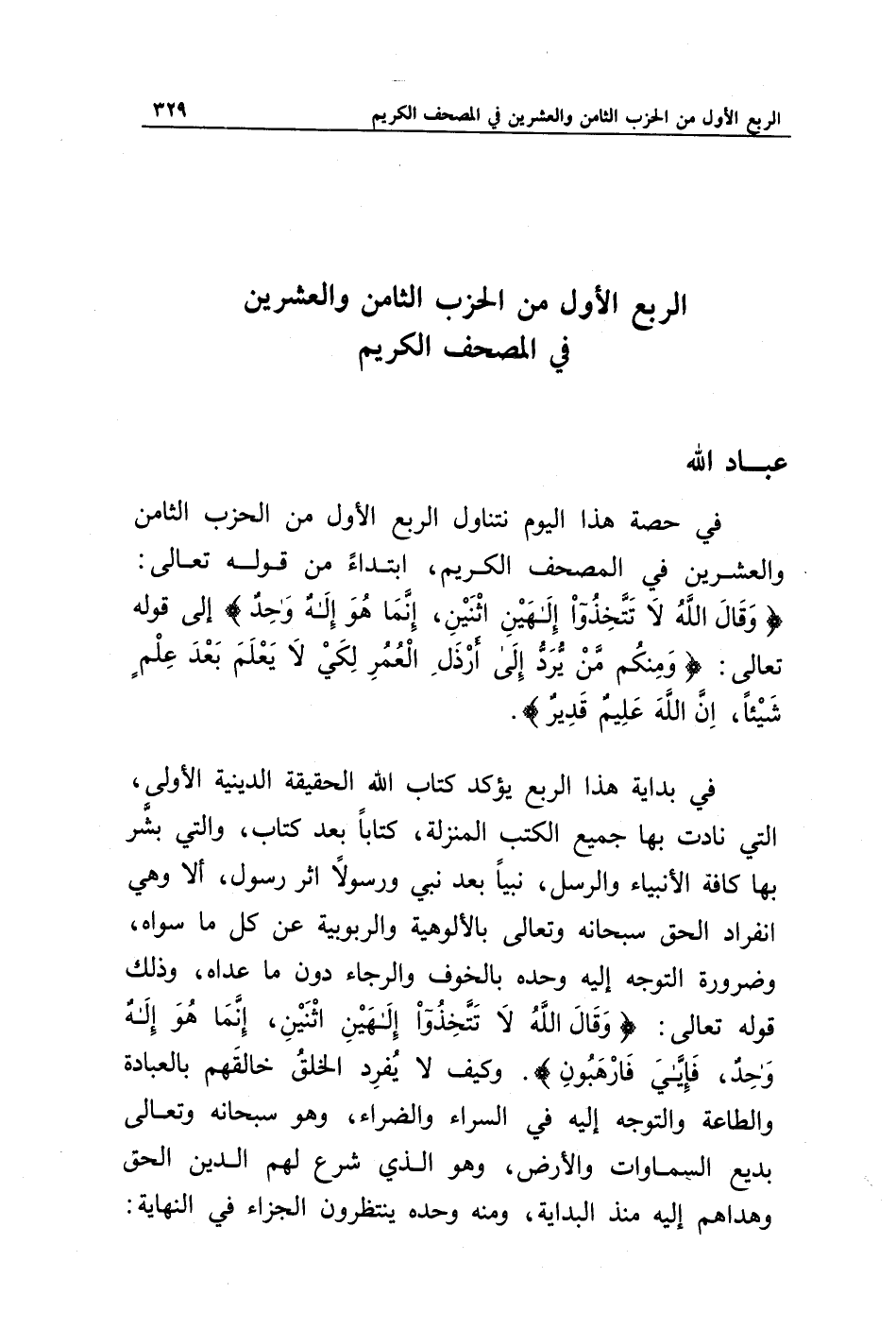 في حصة هذا اليوم نتناول الربع الأول من الحزب الثامن والعشرين في المصحف الكريم، ابتداء من قوله تعالى: {وَقَالَ اللَّهُ لَا تَتَّخِذُوا إِلَهَيْنِ اثْنَيْنِ إِنَّمَا هُوَ إِلَهٌ وَاحِدٌ} إلى قوله تعالى: {وَمِنْكُمْ مَنْ يُرَدُّ إِلَى أَرْذَلِ الْعُمُرِ لِكَيْ لَا يَعْلَمَ بَعْدَ عِلْمٍ شَيْئًا إِنَّ اللَّهَ عَلِيمٌ قَدِيرٌ}.