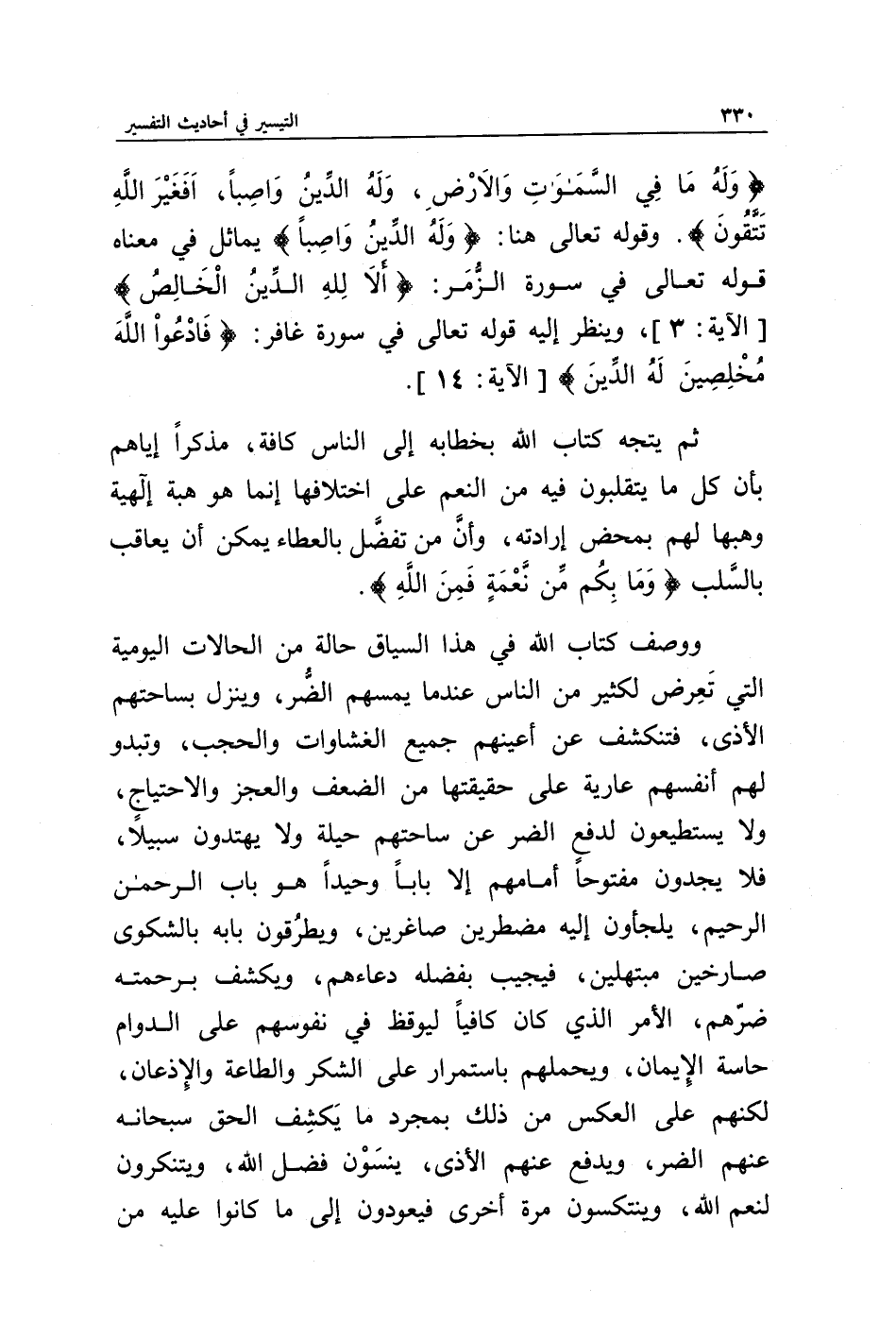 ووصف كتاب الله في هذا السياق، حالة من الحالات اليومية التي تعرض لكثير من الناس عندما يمسهم الضر، وينزل بساحتهم الأذى، فتنكشف عن أعينهم جميع الغشاوات والحجب، وتبدو لهم أنفسهم عارية على حقيقتها من الضعف والعجز والاحتياج، ولا يستطيعون لدفع الضر عن ساحتهم حيلة ولا يهتدون سبيلا، فلا يجدون مفتوحا أمامهم إلا بابا وحيدا هو باب الرحمان الرحيم، يلجأون إليه مضطرين صاغرين، ويطرقون بابه بالشكوى صارخين مبتهلين، فيجيب بفضله دعاءهم، ويكشف برحمته ضرهم، الأمر الذي كان كافيا ليوقظ في نفوسهم على الدوام حاسة الإيمان، ويحملهم باستمرار على الشكر والطاعة والإذعان، لكنهم على العكس من ذلك، بمجرد ما يكشف الحق سبحانه عنهم الضر، ويدفع عنهم الأذى، ينسون فضل الله، ويتنكرون لنعم الله، وينتكسون مرة أخرى فيعودون إلى ما كانوا عليه من